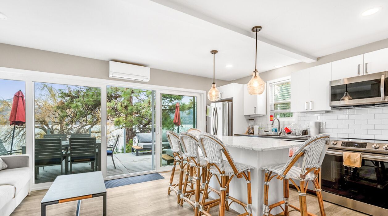 2 full bedrooms and Loft. Both bedrooms have amazing views, and large closets. The master bedroom has a private deck overlooking Okanagan Lake for some magical sunrises. The spacious loft includes a double bed with a large skylight. Fully stocked kitchen with a gas stove and large fridge! We also have a playpen ready to be set up for any little ones! Dining area inside has a large table that can seat up to 10 guests (not in photos). Outdoor dining area is perfect for enjoying a morning coffee or glass of wine.