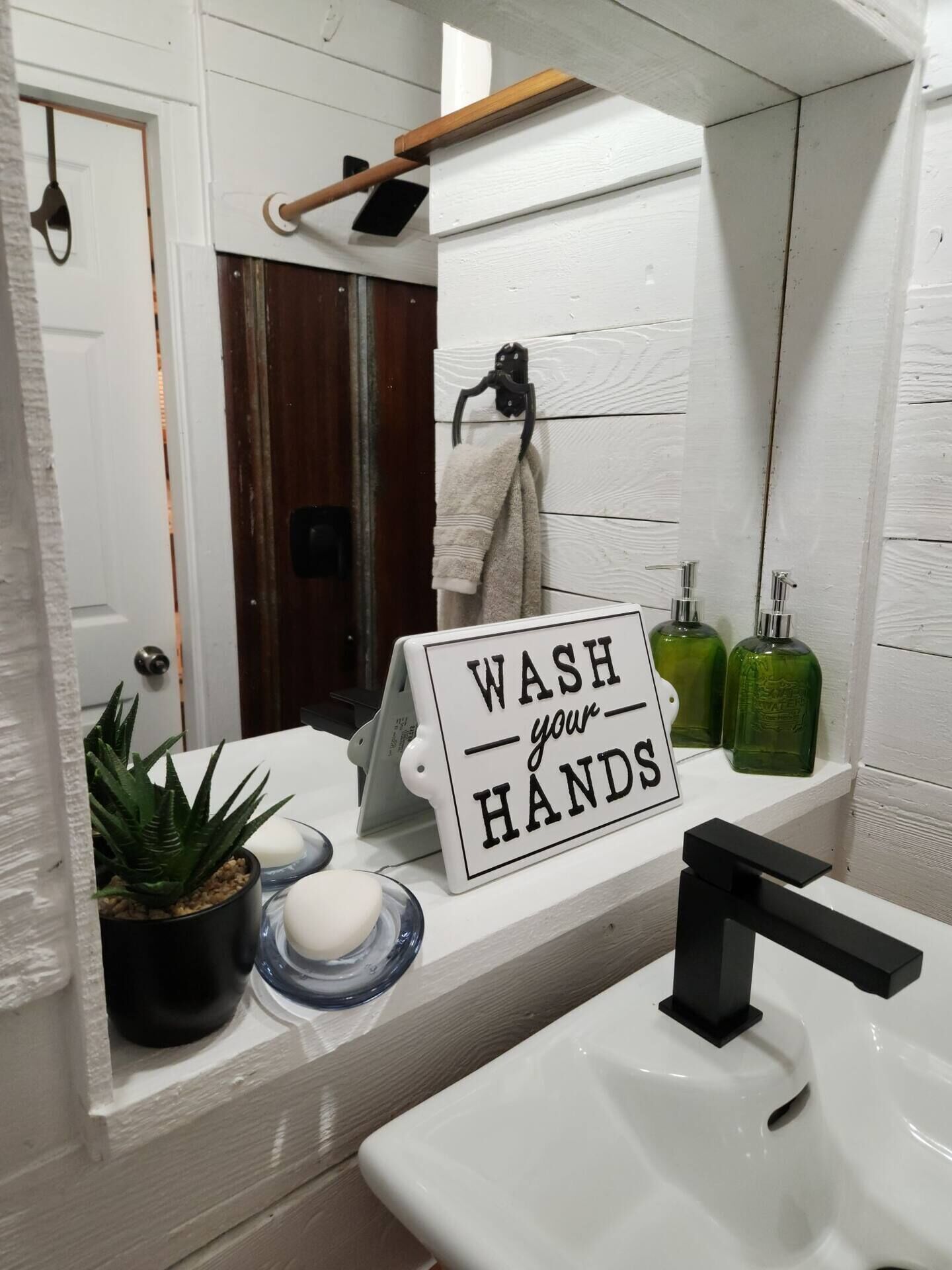 Bedroom Four, our newest addition, is located in a section of converted attic space, with its own entrance off the front deck. A staircase leads you up off the main deck to an outdoor space of your very own! This small yet private deck holds a bistro set perfectly set to capture the extended view from this aerial perch. Inside, you will find two double beds, a vintage chair and handmade table by the window. The room is lit by the sun capturing skylight, two bedside lights, and an extraordinary antique handmade swag lamp over the larger dresser. The decor colour palette is white, gold, green, and sisal.