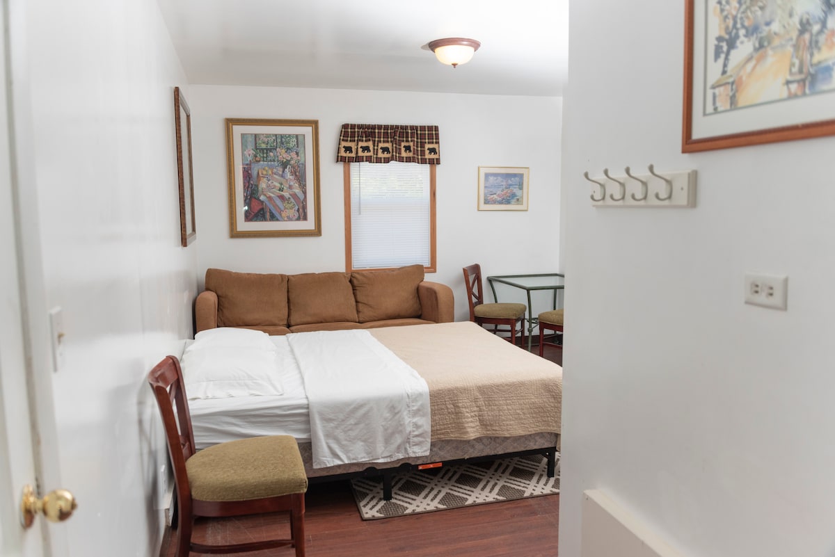 This charming waterfront cabin, originally built in the 1940s and thoughtfully updated, combines rustic charm with modern amenities. Accommodating up to 12 guests across 4 bedrooms and 2 bathrooms, it features a spacious living room with a custom stone wood-burning fireplace (decoration only, not for use) and a cozy kids’ loft with books, games, and an extra pull-out sleeper. The cabin’s original woodwork and warm interiors create a welcoming atmosphere.
