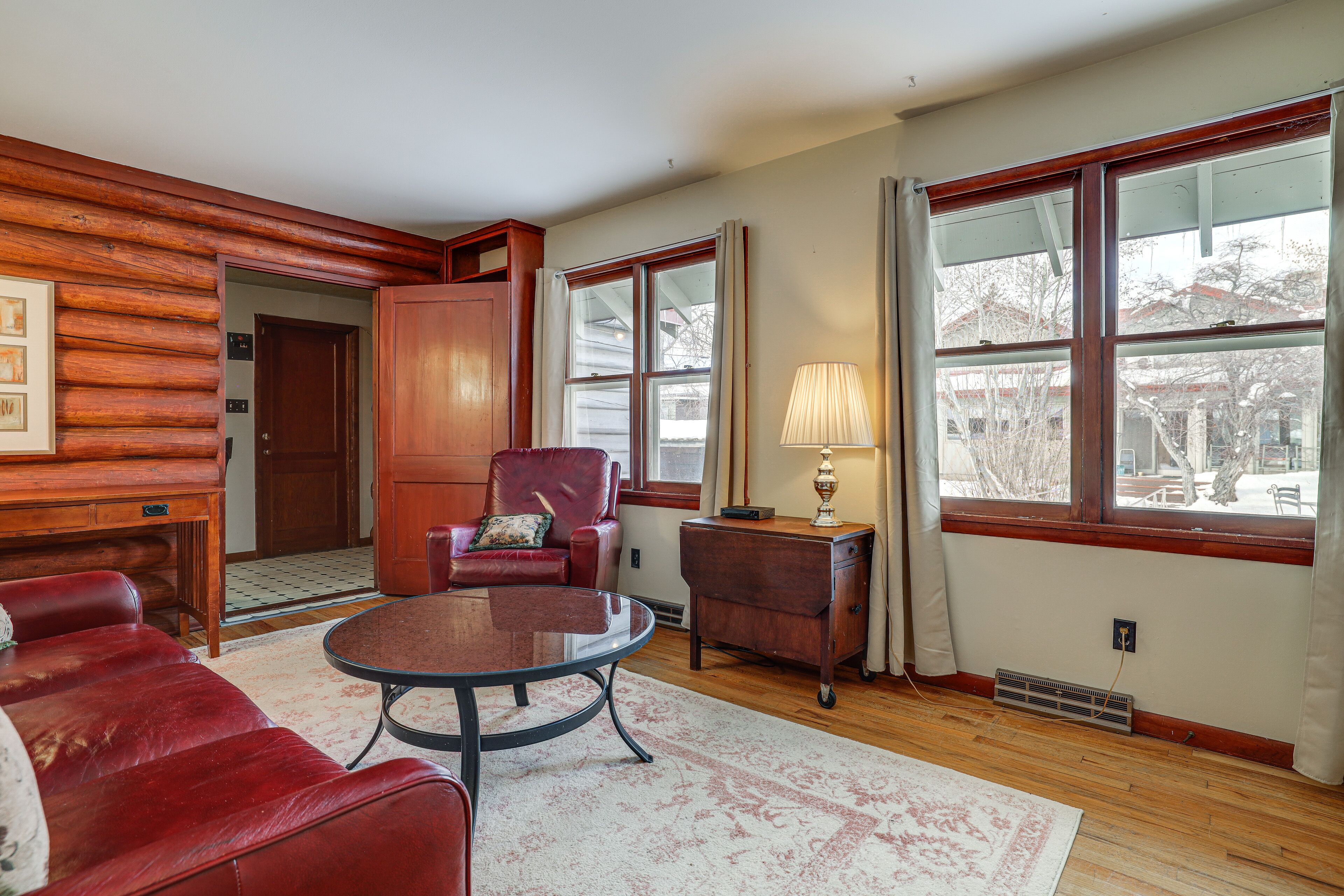MAIN FEATURES: Dining table, log accents, yard w/ mature trees, patio, outdoor dining set, 850 sq ft