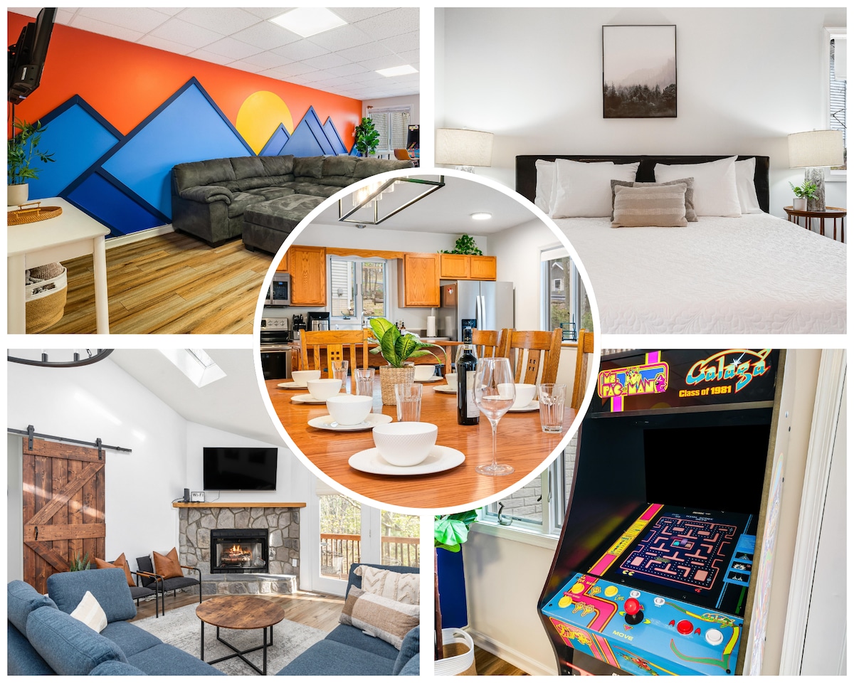Escape to Paradise at Poplar Skies! This jaw-dropping Massanutten retreat will take YOUR breath away with sweeping mountain vistas and luxurious amenities. Imagine yourself soaking in the covered hot tub, playing classic arcade games, or sharing laughs around the stunning fire table. The showstopping custom mural and locally sourced poplar wood create pure mountain magic. Minutes from skiing and hiking, this dreamy getaway turns YOUR vacation dreams into reality.