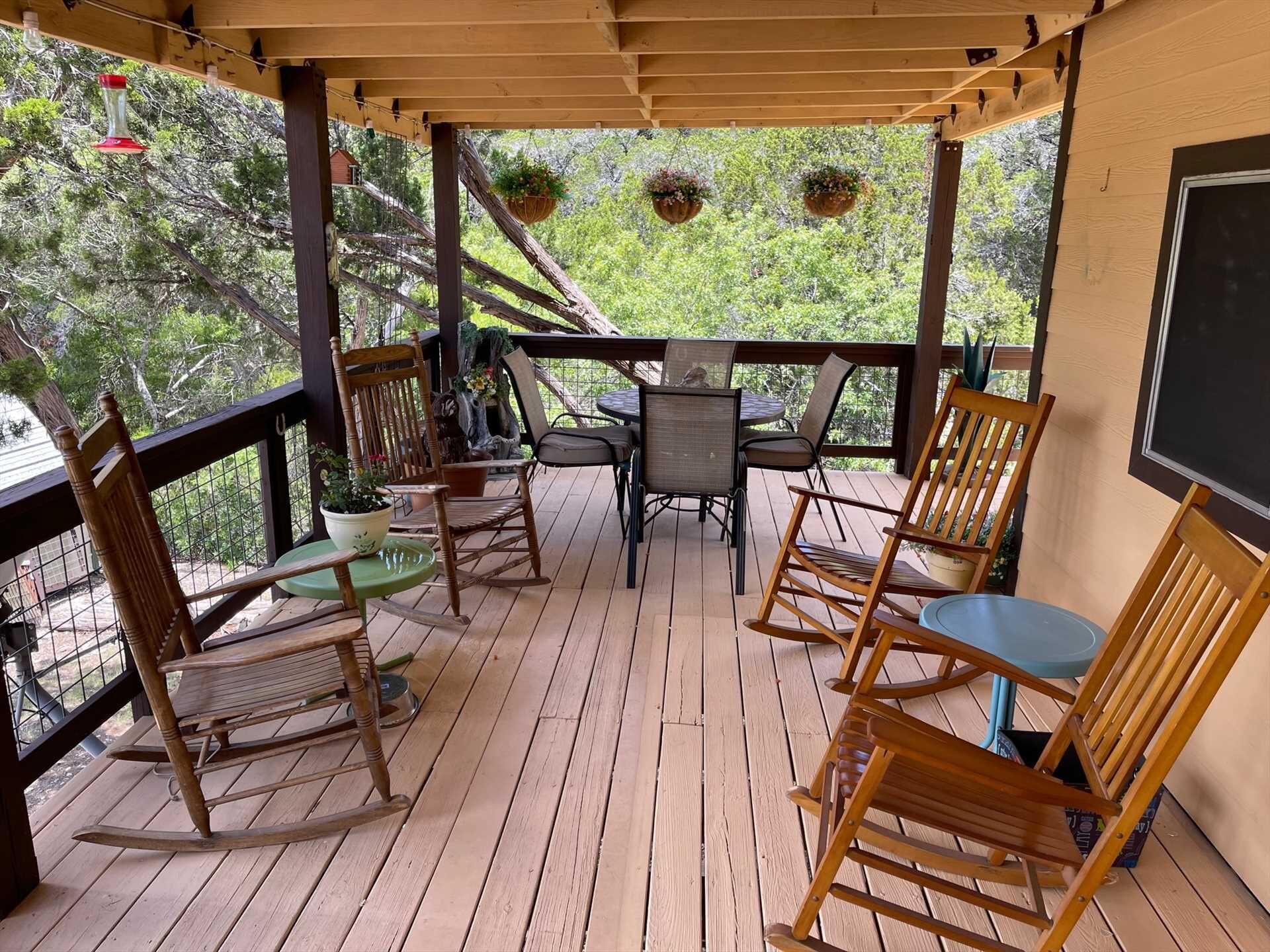 Our covered back patio faces Medina Lake and gives a wonderful view of the lake and dam! We have a charcoal BBQ grill (please bring your own charcoal). The back patio has a 6 person outdoor table, 4 person outdoor table, fire pit with 4 Adirondack style chairs, and miscellaneous other chairs.