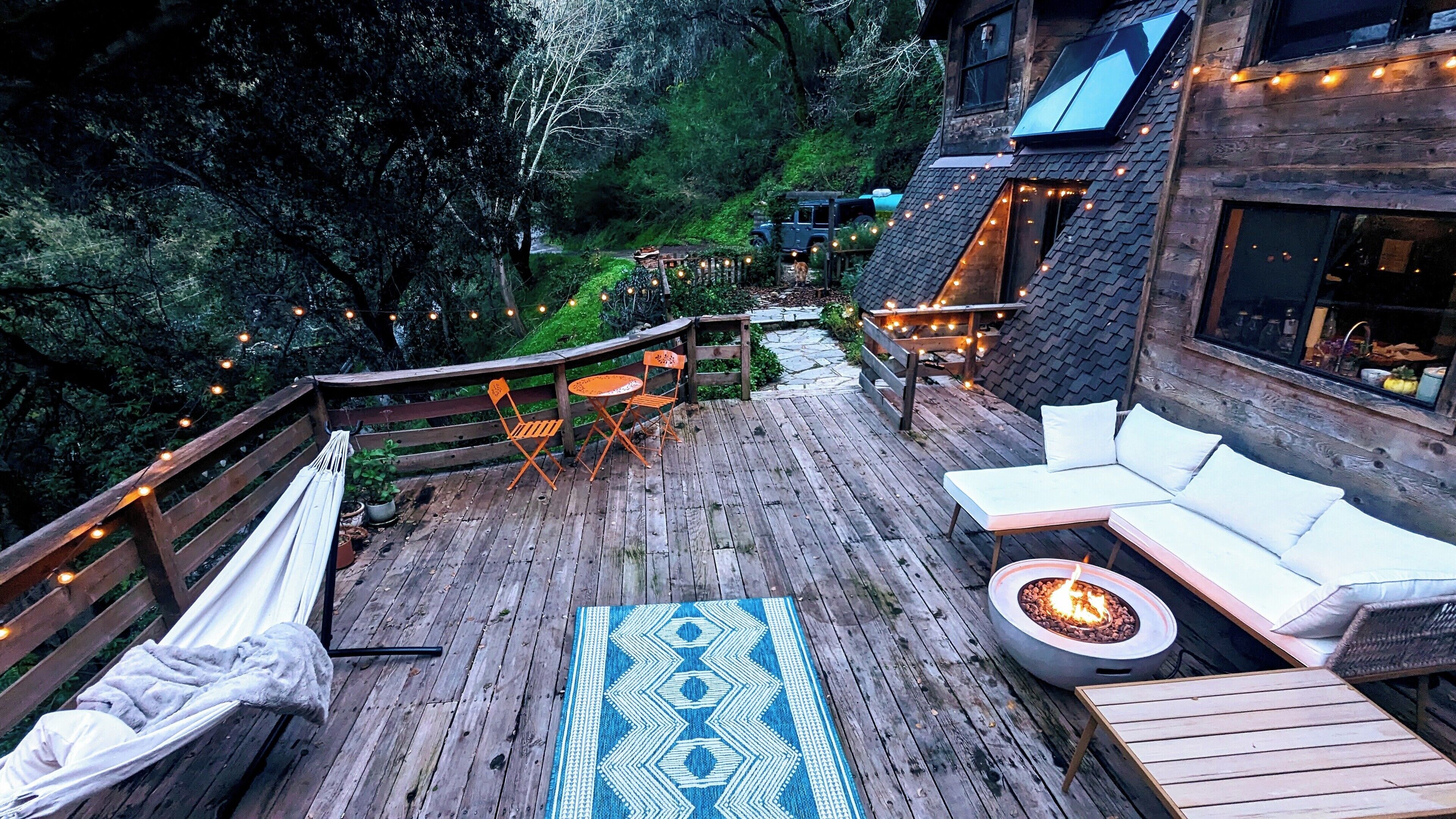 Step outside onto the wrap-around balcony with a bistro dining area, take in the stunning ridges and forest below, or relax in the two-person hammock. For a truly magical experience, dine on your own mountaintop terrace, surrounded by flowers and embraced by redwoods, madrones, and oaks. At night, gaze at a star-filled sky—unobstructed by city lights.