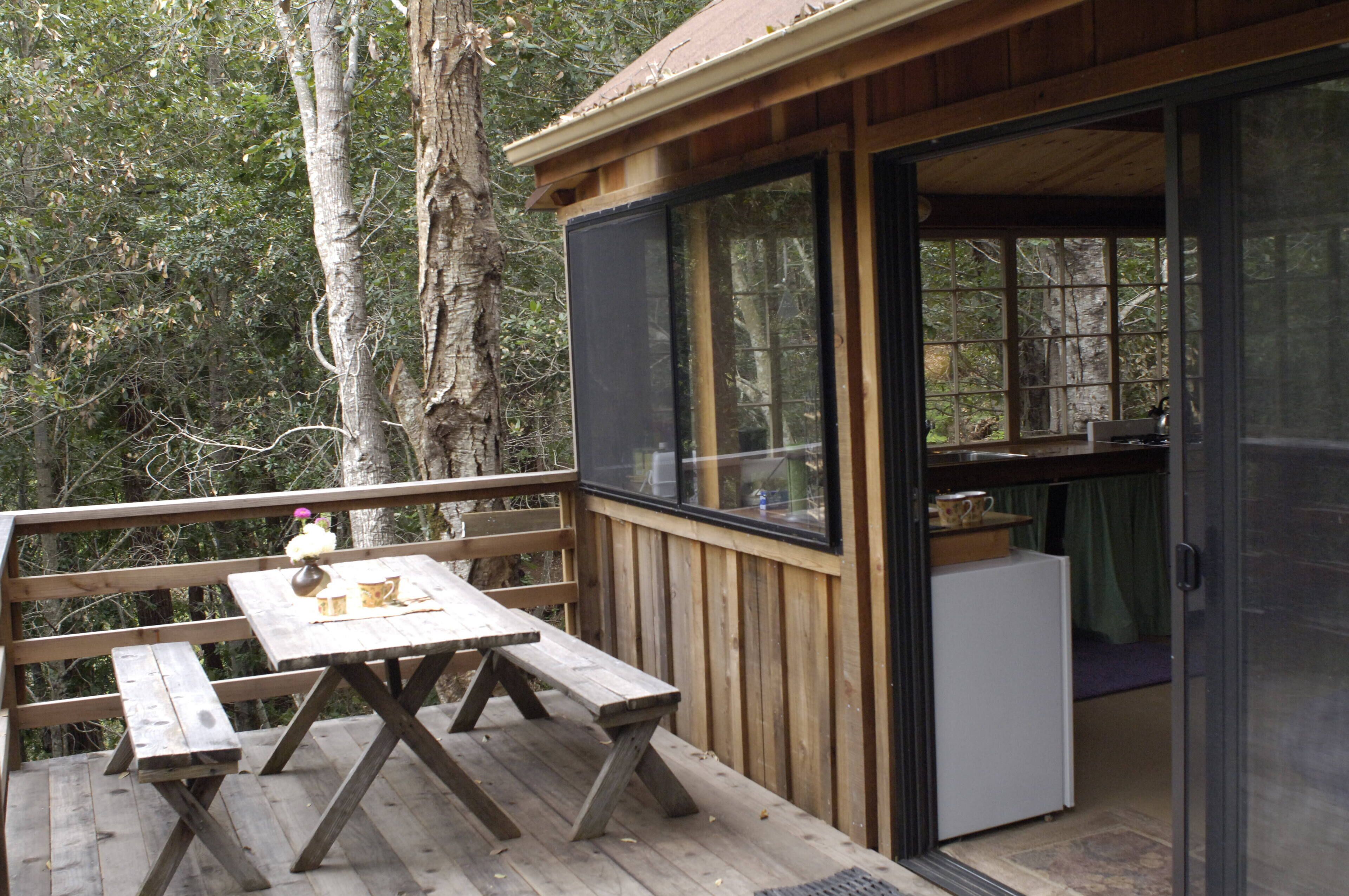 This is a secluded gem of a cabin with craftsman touches in a very lovely setting. It sits in a private corner of the property with magical filtered light through the oak and redwood forest. South facing with a beautiful mountain/canyon view it is very spacious (aprox 600sf) with the tinted plaster walls and arches giving it a very warm, old world feel. The quaint little bedroom is accessed by an outdoor covered staircase and has a spectacular view of the canyon. There is very nice deck space on three sides of the cabin, where one can sit in sun or shade while enjoying the abundant bird life and forest/mountain/canyon views. Or relax in our deep clawfoot tub that sits in our redwood gardenroom. Deer and quail are commonly seen, with the occasional glimpse of a bobcat or fox. And no need to bring your own water, we've plenty of good well water here.