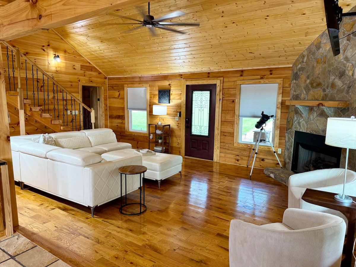 A wrap around porch with rocking chairs and a porch swing is located outside the cabin. This perfect space for morning coffee and evening drinks overlooks a pond with a beautiful water fountain, and gorgeous open fields. A small creek is a few steps away from the cabin.
