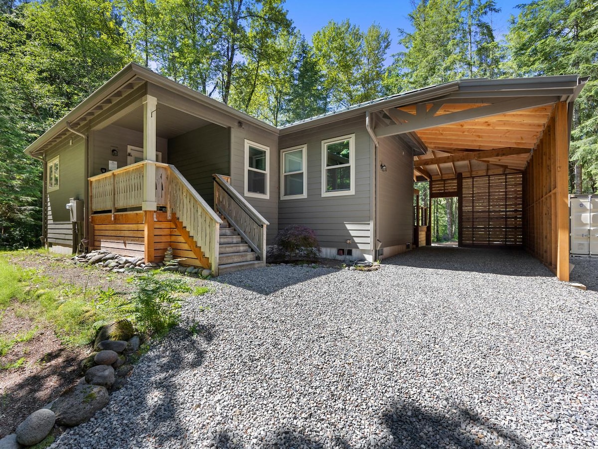 Welcome to your modern cabin retreat nestled on the edge of a 22 acre wooded parcel and a seasonal creek in Rhododendron, Oregon. Located across the street from the Sandy River and just 10 miles from Government Camp/Mt. Hood, this 2-bedroom, 1-bathroom cabin is perfect for up to 6 guests. Silver Cedars Cabin offers a one-of-a-kind experience, with handcrafted furniture, unique flooring, and custom concrete countertops featuring recycled glass, all built by the homeowners themselves.