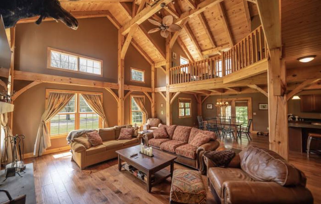 The house is equipped with a sound system throughout for entertaining. The cabin is warm and inviting with lots of natural wood perfect for relaxing.