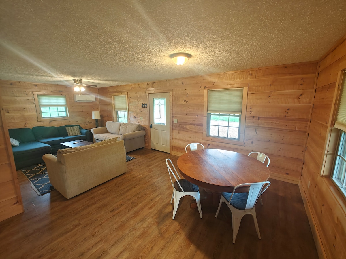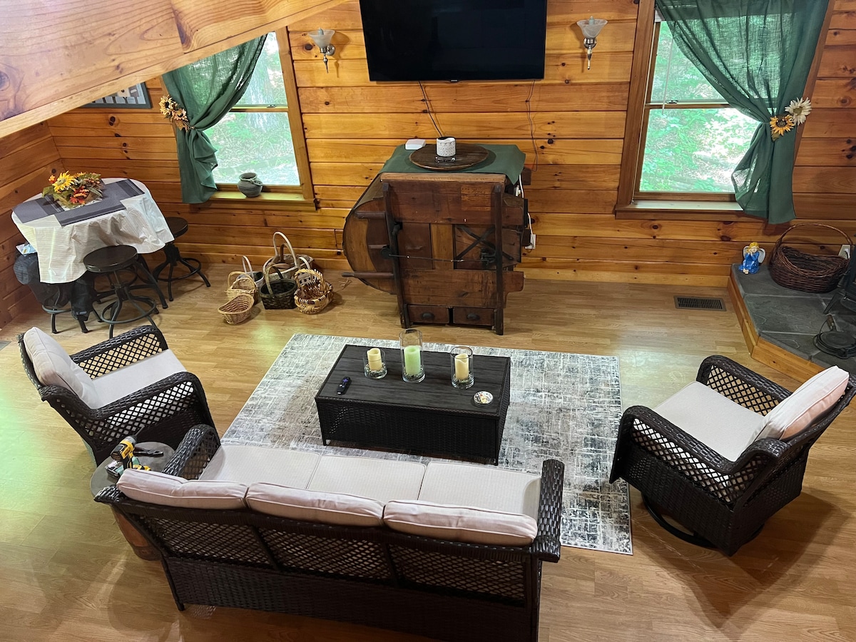 3 bedroom cabin with an upstairs and downstairs sitting room. Open concept living and dining room.