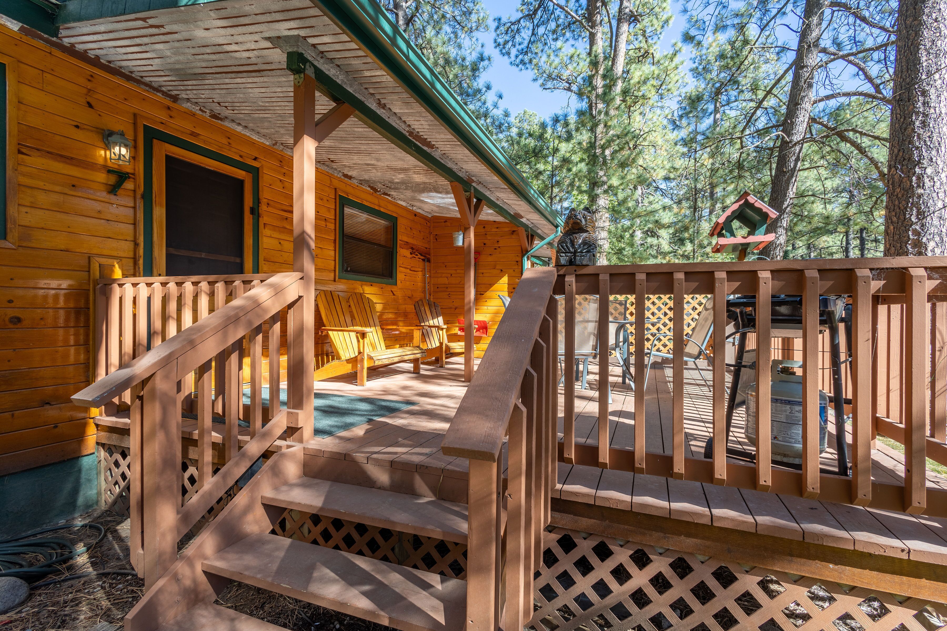 If your idea of relaxation is being exhausted from exploring Bear Creek Canyon, enjoying bird watching from your covered deck, hiking up Double E Ranch Trail or just soaking up the peaceful quiet, you’ll want to stay at the Pinon Log Cabin.