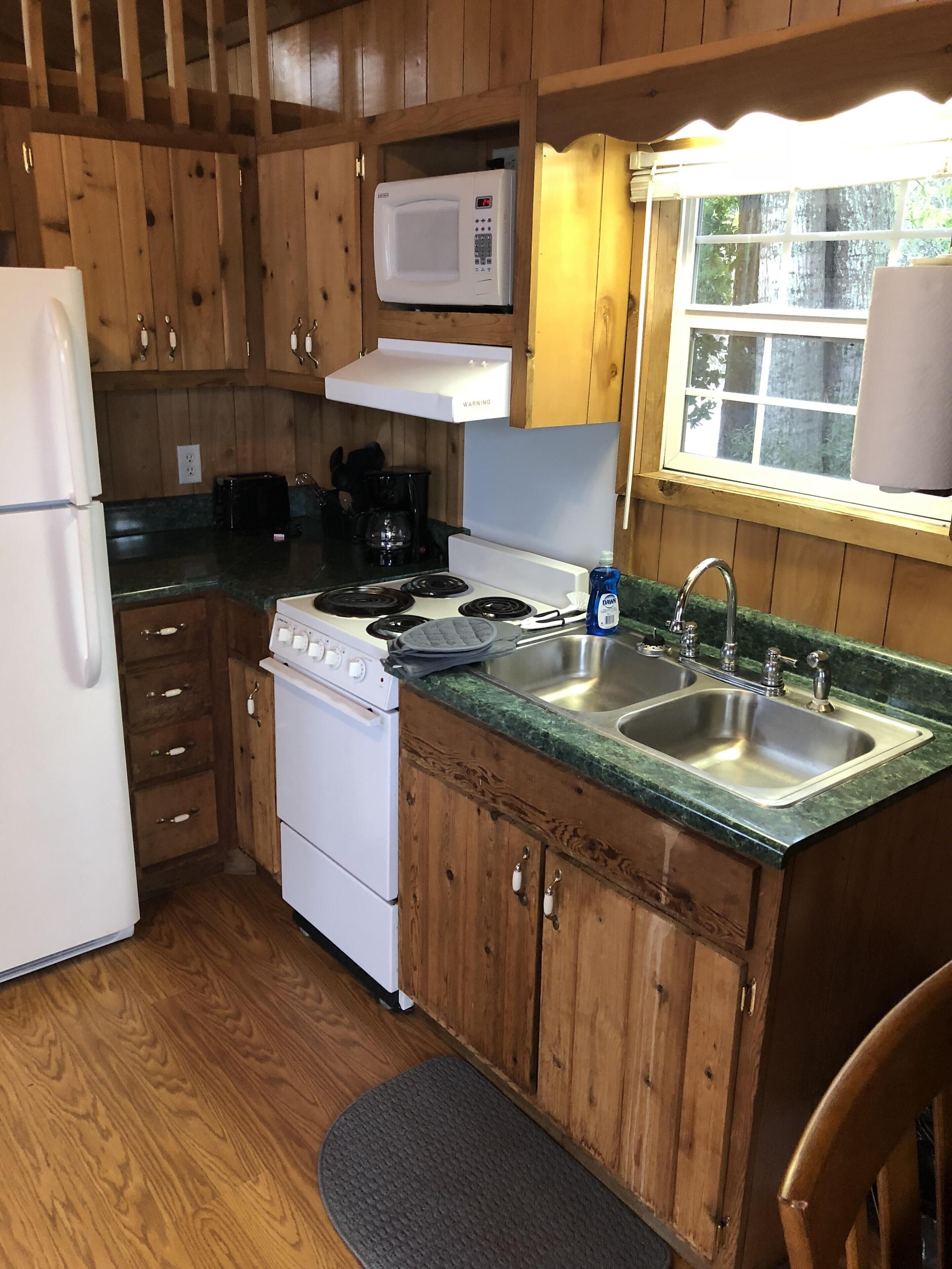 The living area is an open floor plan. The Kitchen is fully equipped with a full size refrigerator/freezer, oven, microwave, coffee pot, and toaster. All of your Kitchen needs are provided in your rental. (Pots, pans, utensils, plates, bowls, and cooking utensils. Their is a Rocky top cedar dining table that sits 4 as well. The living room includes a full size sofa and also a love seat with a smart tv.