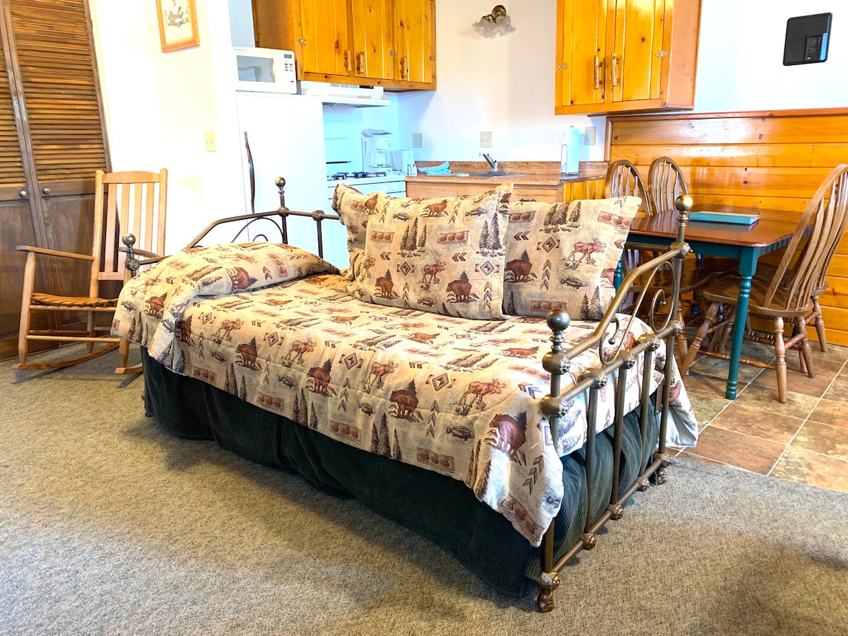 First floor, left side of lodge. Studio with queen bed and daybed (with pull-out mattress), kitchen, dining area and gas fireplace/stove. Pet friendly