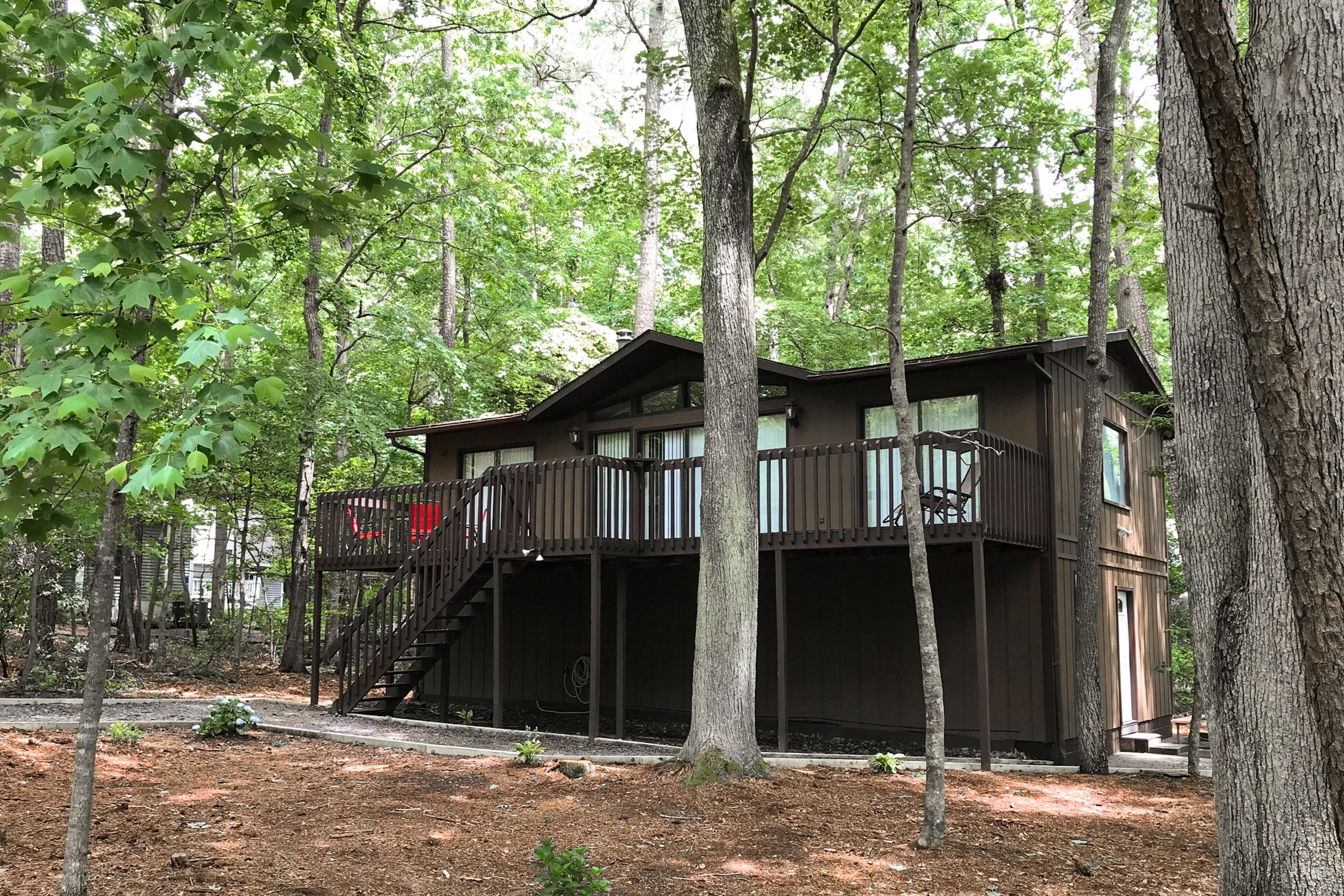 - "Just enough for our family of 8 (3 adults and 3kids plus two dogs). The deck was awesome and we loved the space. Everyone could spread out some it was perfect." - "Little cabin in the woods. Great for family vacation but I would need more handicap friendly place. Kids had a great time. Loved being able to bring the fur babies with us." - "The property was very spacious. The downstairs level looked to be brand new, beautiful bathroom with 2 decent size bedrooms. It ended up just being my husband and I with the dogs so we had no need to stay on that level but it was nicely done. There is a dog friendly park right around the corner from the House with plenty of open field for the dogs to run around. We loved our stay. The only negative I will mention is that because the property is in a wooded area, the walkway and entire deck were covered with leaves, debris which had my father, who lives locally, not come over with his leaf blower, we probably wouldn’t have gotten much use out of the outdoor space. But overall a great property!"