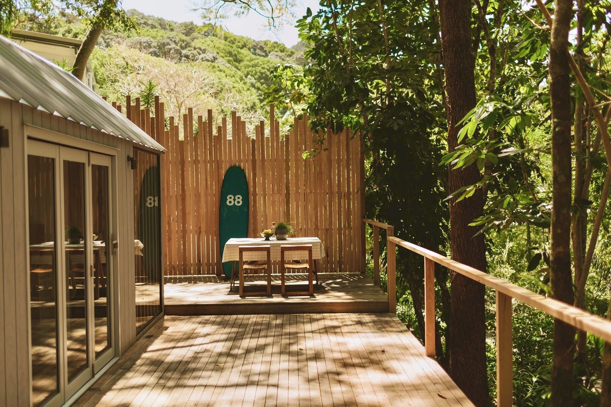 The home is fully functional and beautifully designed, creating a comfortable and cosy stay. The space has a queen size bed with linen bedding, storage underneath the bed, a fireplace, a shower with a view, vanity, toilet, kitchenette, an indoor dining set option, opening to a large deck with table and chairs, outdoor umbrella, two deck chairs, an outdoor bath, and a surfboard on offer.