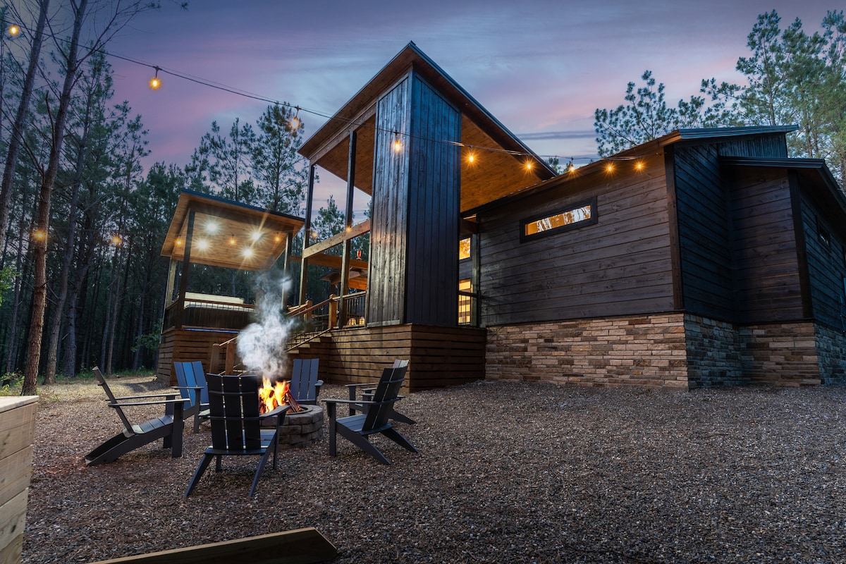 Welcome to the Fade Away Cabin! Imagine the kids playing on the play-set outside, sinking into a relaxing hot tub with a great view, warming up next to a nice warm crackling fire pit, and smelling fresh pines when you wake up. This modern style cabin balances the natural beauty of Broken Bow with luxuries to offer the ideal place for a rejuvenating vacation.
