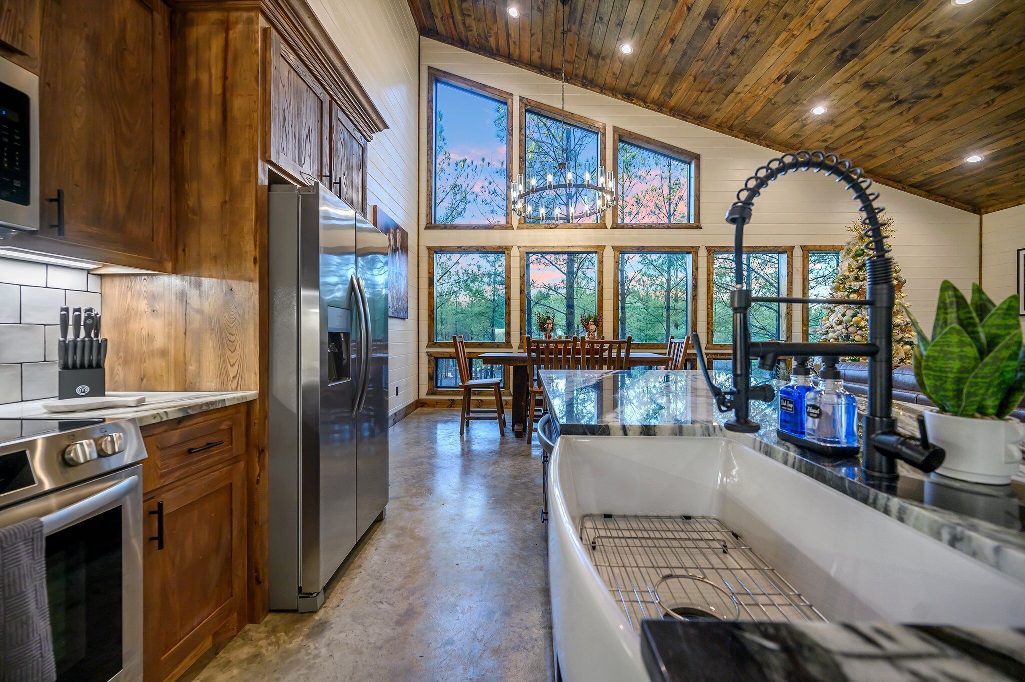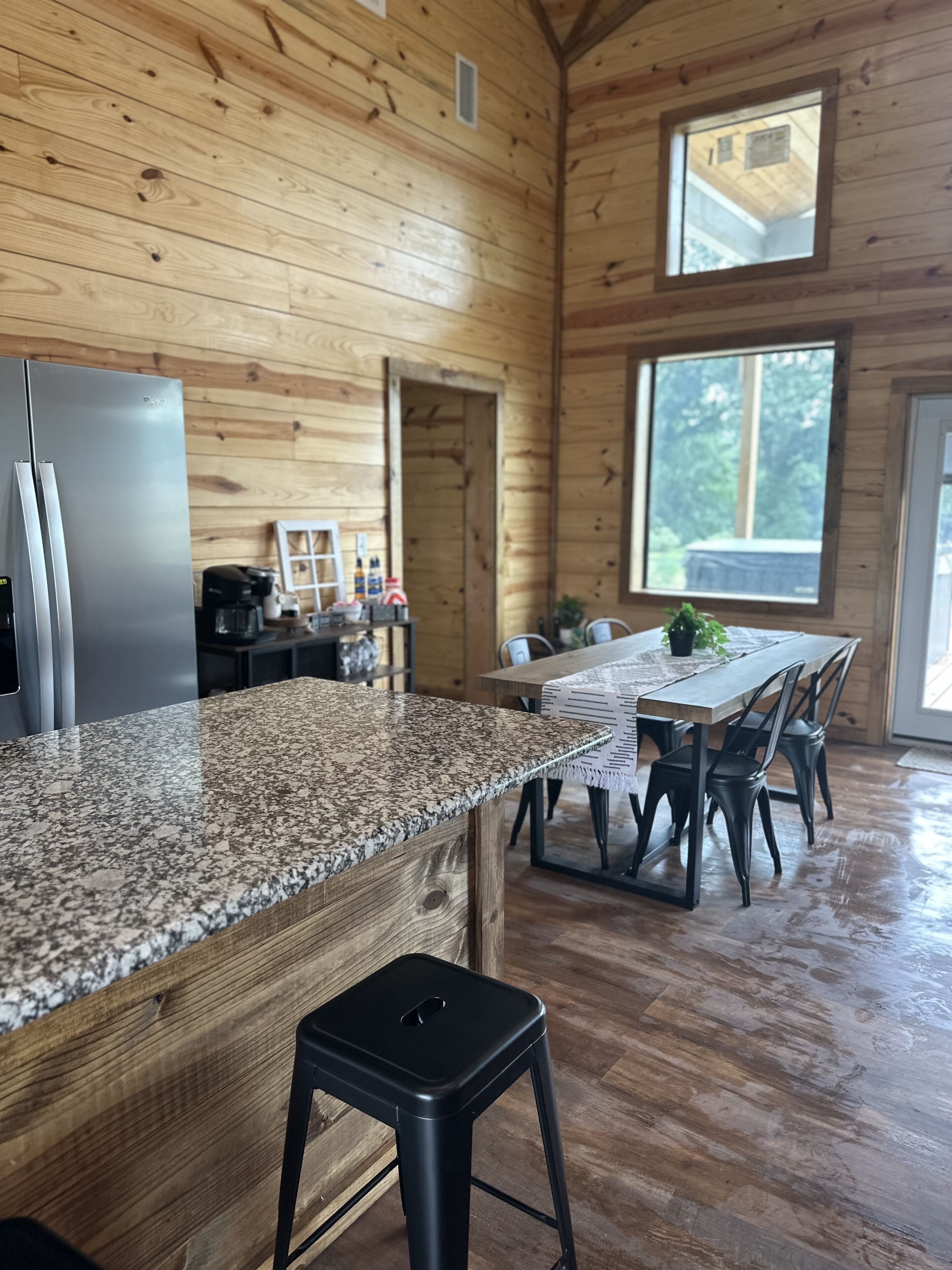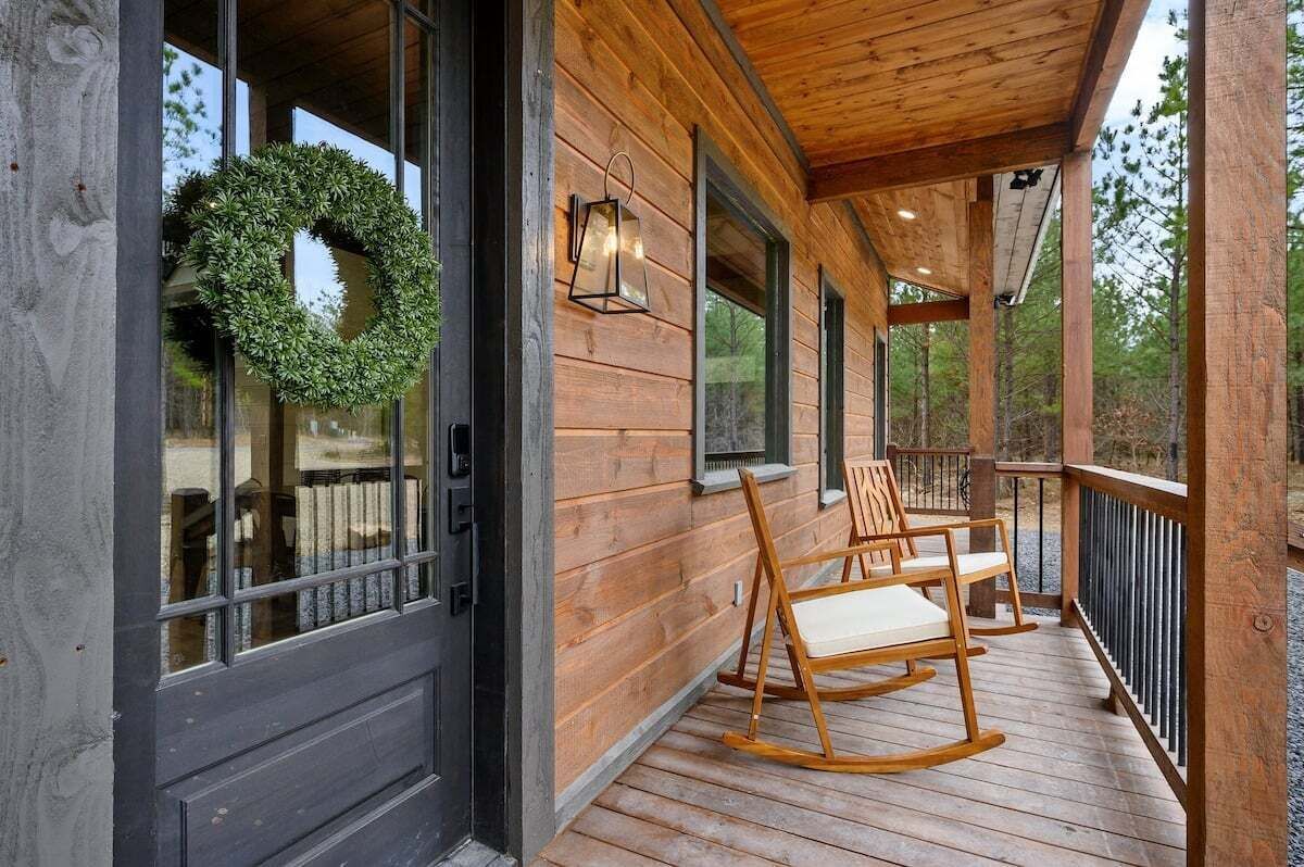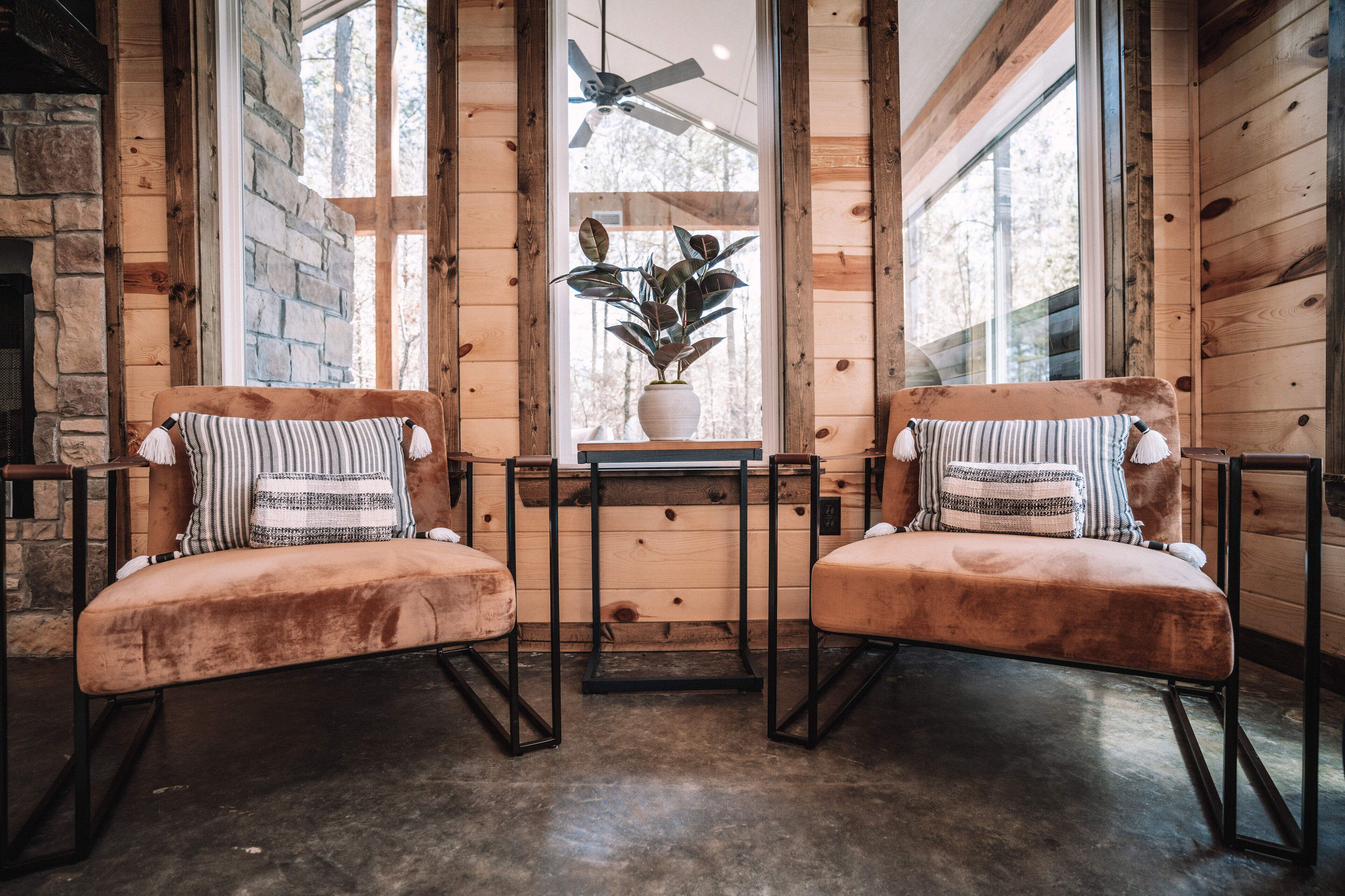 Elevated Grounds offers luxurious accommodations for up to 8 guests, featuring two king en suites and a cozy bunk room with four twin beds, each with its own en suite for added comfort and convenience. Large windows coat the cabin, inviting the sunshine to dance throughout the space, creating a fresh and energizing atmosphere.