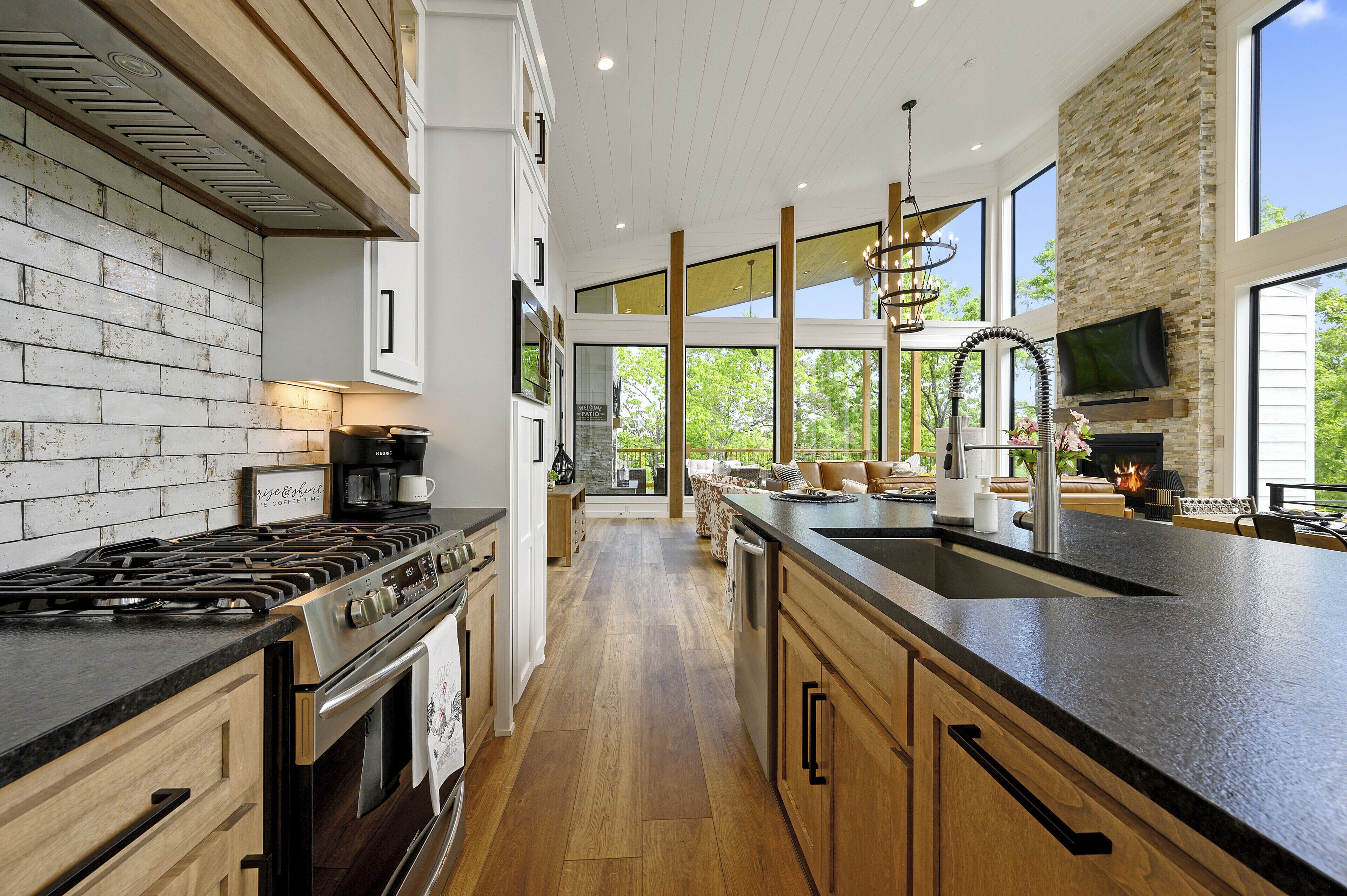 Beautiful wood floor panels stretch out as far as the eye can see across the open-concept living room. Coupled with the high ceilings and incredible views, you'll feel a sense of space and wonder from the moment you step inside. Relax on the comfy leather couch in front of the fireplace, enjoy your favorite shows on the smart TV, or simply soak in the awesome views.