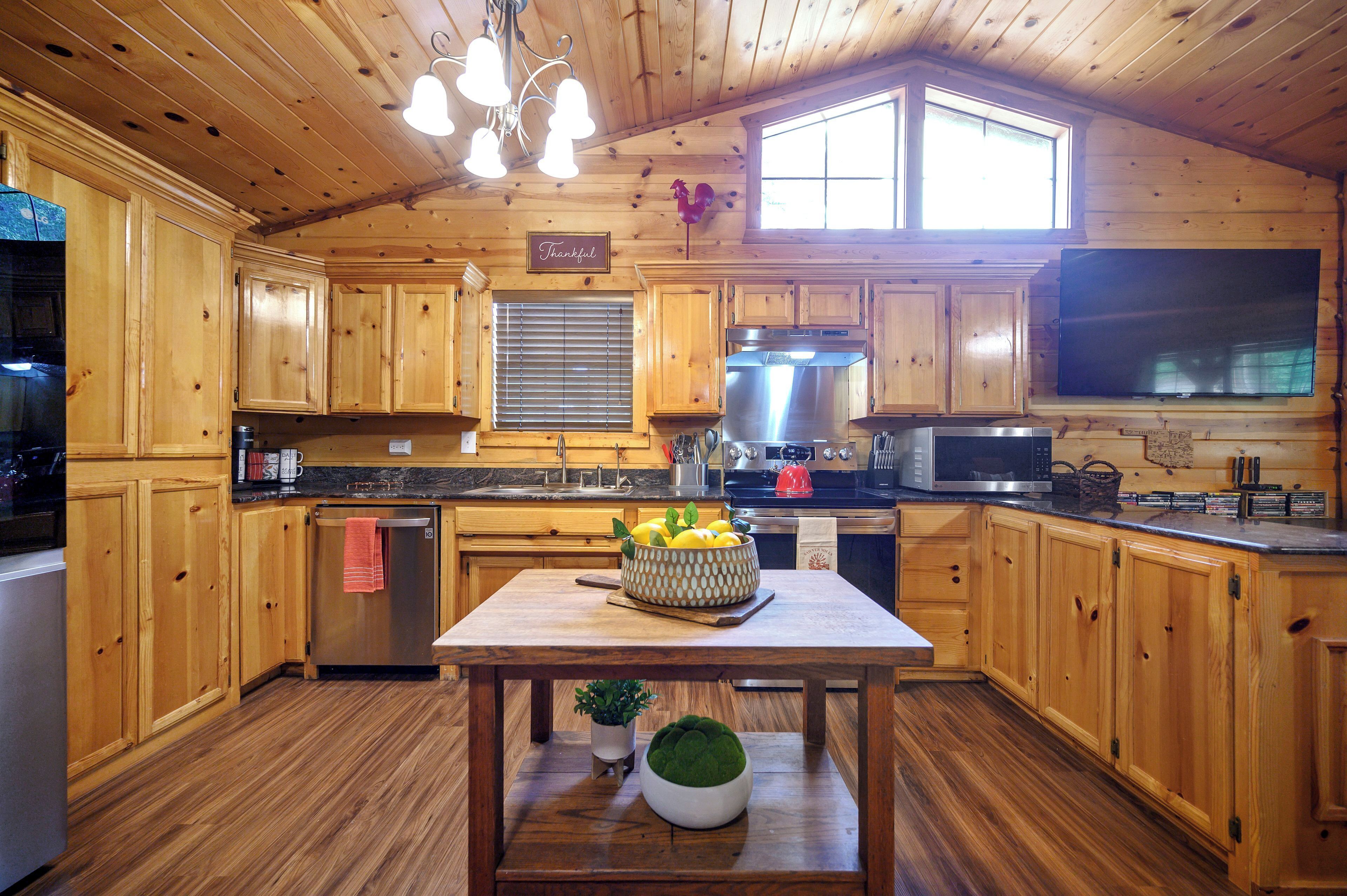 Relax in the rooftop private hot tub (enjoy the outdoor furniture!) or sip a drink in the outdoor entertainment area of this cabin. As for the great indoors, you can come inside and enjoy the free WiFi and digital TV.
