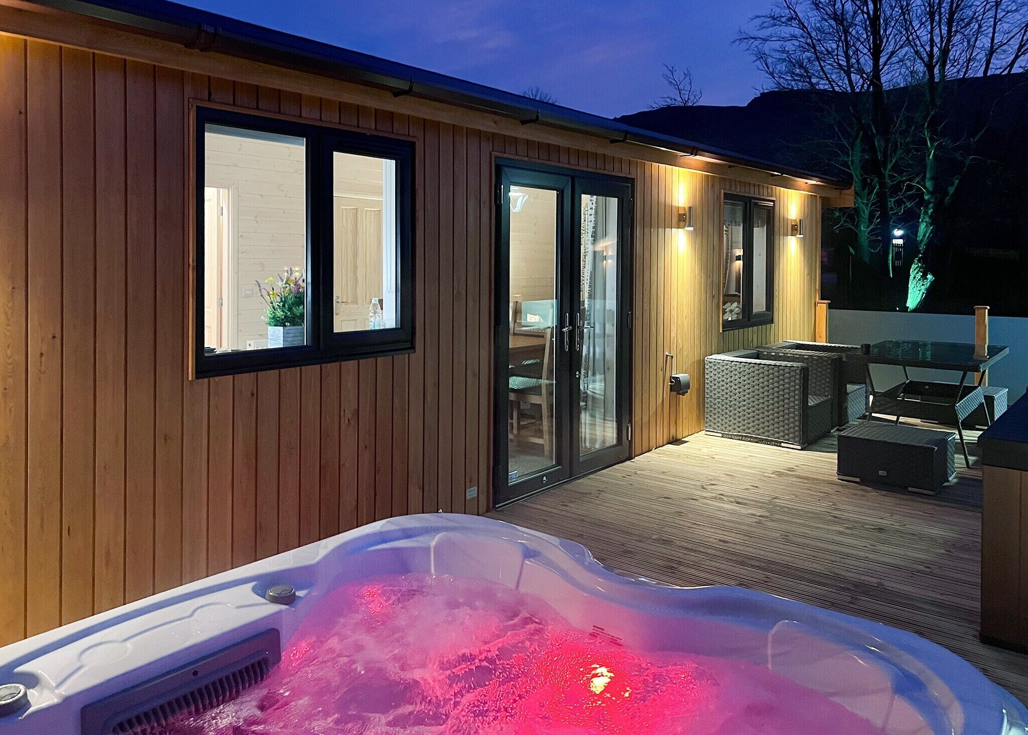 Dovestone Luxury Lodges consists of an open-plan kitchen/living/diner with electric oven, gas hob, microwave, fridge/freezer, dishwasher, dining seating for six people, and sitting area with Smart TV and Bluetooth speaker. The bedrooms consist of a double with TV and en-suite, a twin, and sofa bed, with a bathroom. Outside, there is an enclosed veranda with decking, furniture, barbecue, and hot tub, and designated, off-road parking for one car. Sorry, no pets. Sorry, no smoking. WiFi, fuel, power, bed linen, and towels are all inc. in rent. Dovestone Luxury Lodges is a relaxing base for a Greater Manchester escape. Note: Early check-in and late check-out available for 25 GBP. Note: Travel cot and highchair each cost 10 GBP. Note: Barbecue coals available to buy. Note: Hot tub ready to use from 6pm on day of arrival. Note: Extras and packages available from 5 GBP to 95 GBP. This property has a Good Housekeeping Bond of 250 GBP. Arrivals are only permitted on Mondays and Fridays.