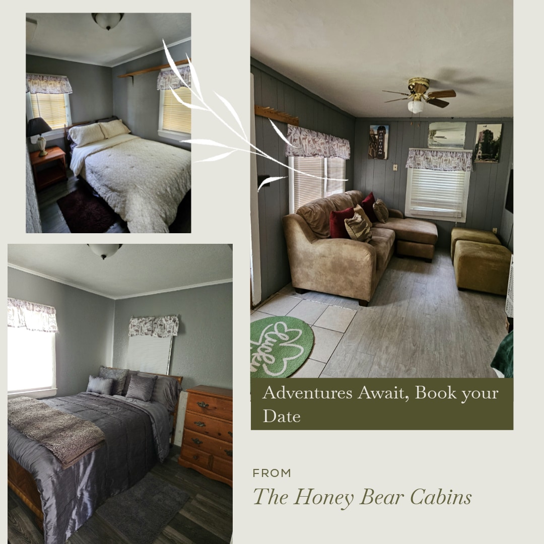 Each of our cabins is just under 500 sqft made of either knotty pine or modern panels, and boasts two bedrooms, each containing a queen sized bed. Cabins are professionally cleaned and disinfected between guests, and new linens and towels are placed. Water and sewer are municipal. Cups, plates, pots, flatware, and basic cooking utensils are provided. Kitchens include toaster ovens, basic ranges, and refrigerators.