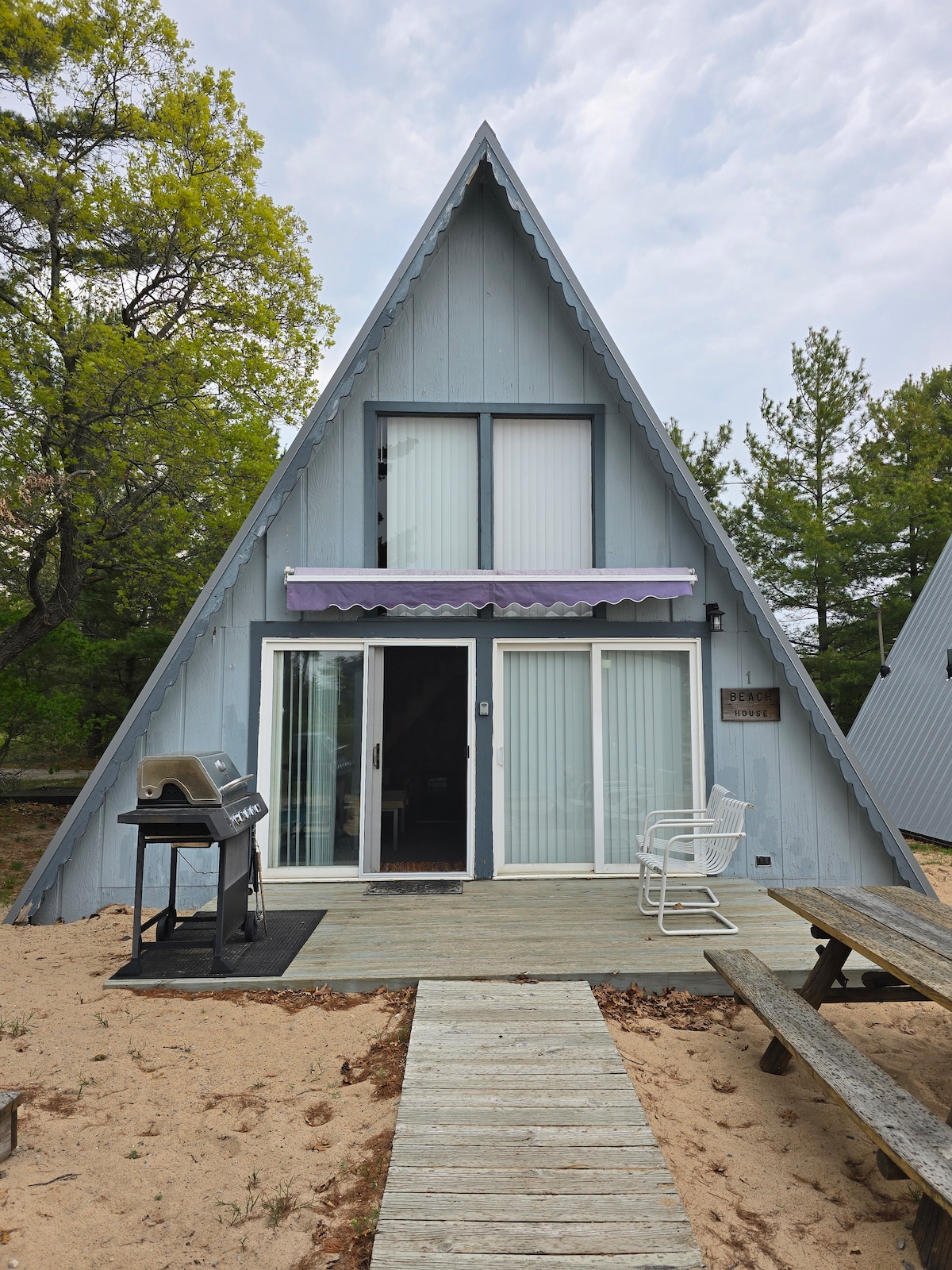 ☀ Charcoal grill, picnic table, patio chairs, and some beach toys