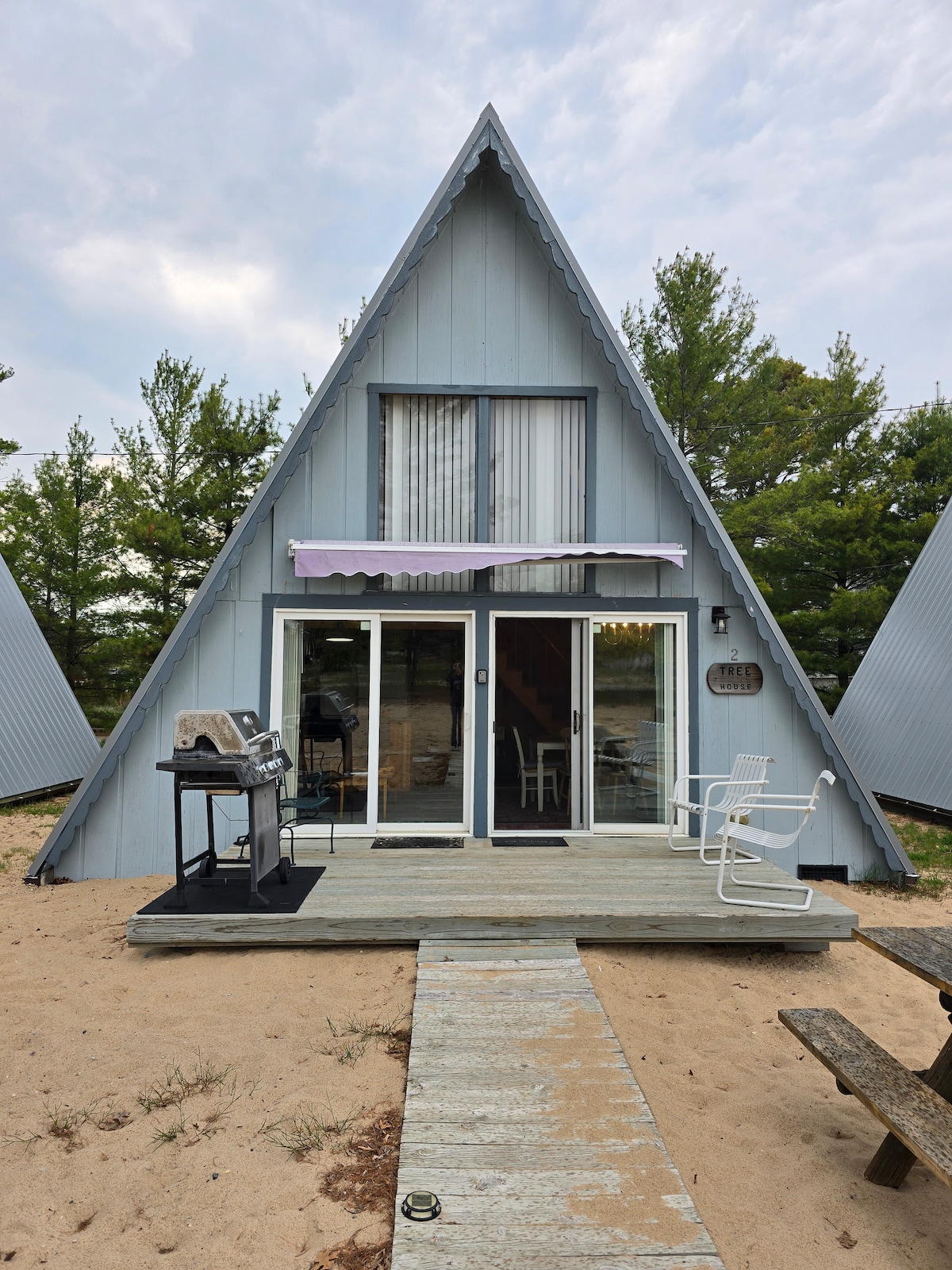 While it’s a couple cabins back from the beachfront, the screen door and patio open up to a direct view of Lake Huron. You’re still only steps from the sand.