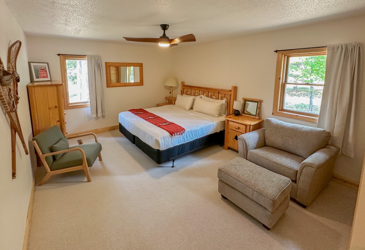 Renovated in 2021, the Loon's Nest features all new appliances, floors, carpet, walls and bathrooms. Just steps away from the lake and private dock. We call the Loon's nest our upside down house because the main living area is a walk out to the patio, lawn, firepit and lake; while the upstairs is the main rear entrance and has four of the five bedrooms. On the top level; the master bedroom faces the lake and features a king bed, fireplace and tv. The bunk room features two queen sized bunks. Also on the top floor, there are two loft rooms. One features a queen canopy bed with privacy screen and private deck to the outdoors. The other loft room is up a ladder and features a king bed, tv, and sitting space. The top floor features one full sized bathroom with an oversized tub. On the main level; kitchen, dinning space, living room, den, bathroom with steam shower, bedroom (queen), and laundry room.