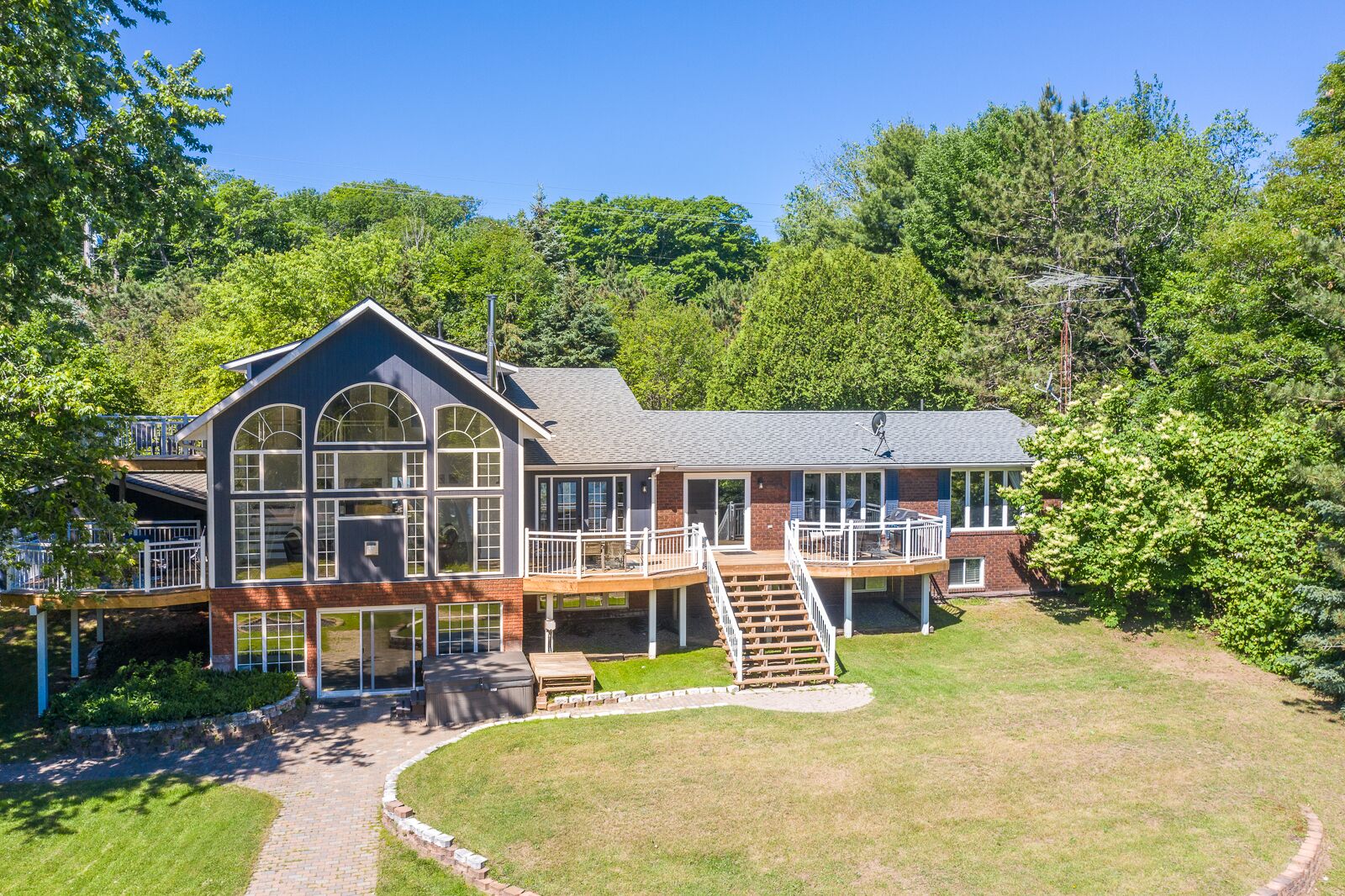 Relax with the whole family at this peaceful place to stay. Nestled on the quiet lake of McKellar, take the canoe out for a sunrise paddle and explore the lake or a quick romantic paddle board at sunset. Built with 3 stunning decks that offer tons of seating the upper level walkout is the perfect place to sit and enjoy all meals of the day. Sit on the dock with your morning coffee and watch the local heron or loon fly past. Enjoy an evening fire and yard games in the wide open grassy yard.