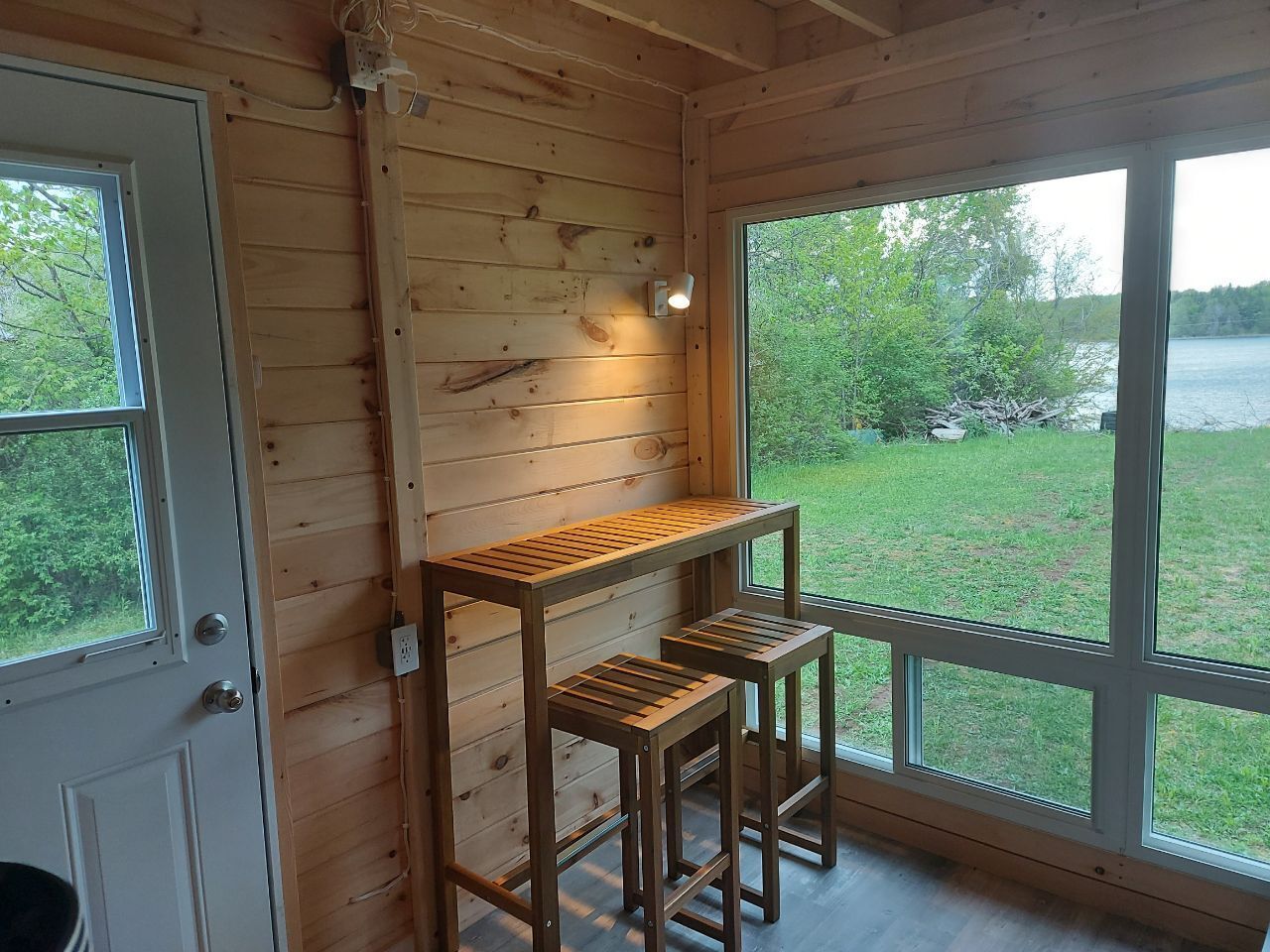 Glamping bunkie with direct view of the lake to help you relax and enjoy your time away from home. Equipped with microwave, mini-fridge, water dispenser and Keurig machine. Queen bed in the loft and two singles in the main level. Basic dishes provided. Huge windows overlooking the lake and all the canoeing, swimming and fishing you want steps away from the door. Outdoor flushing toilet restroom and outdoor shower. Private outdoor area with table & chairs and fire-ring with free wood.