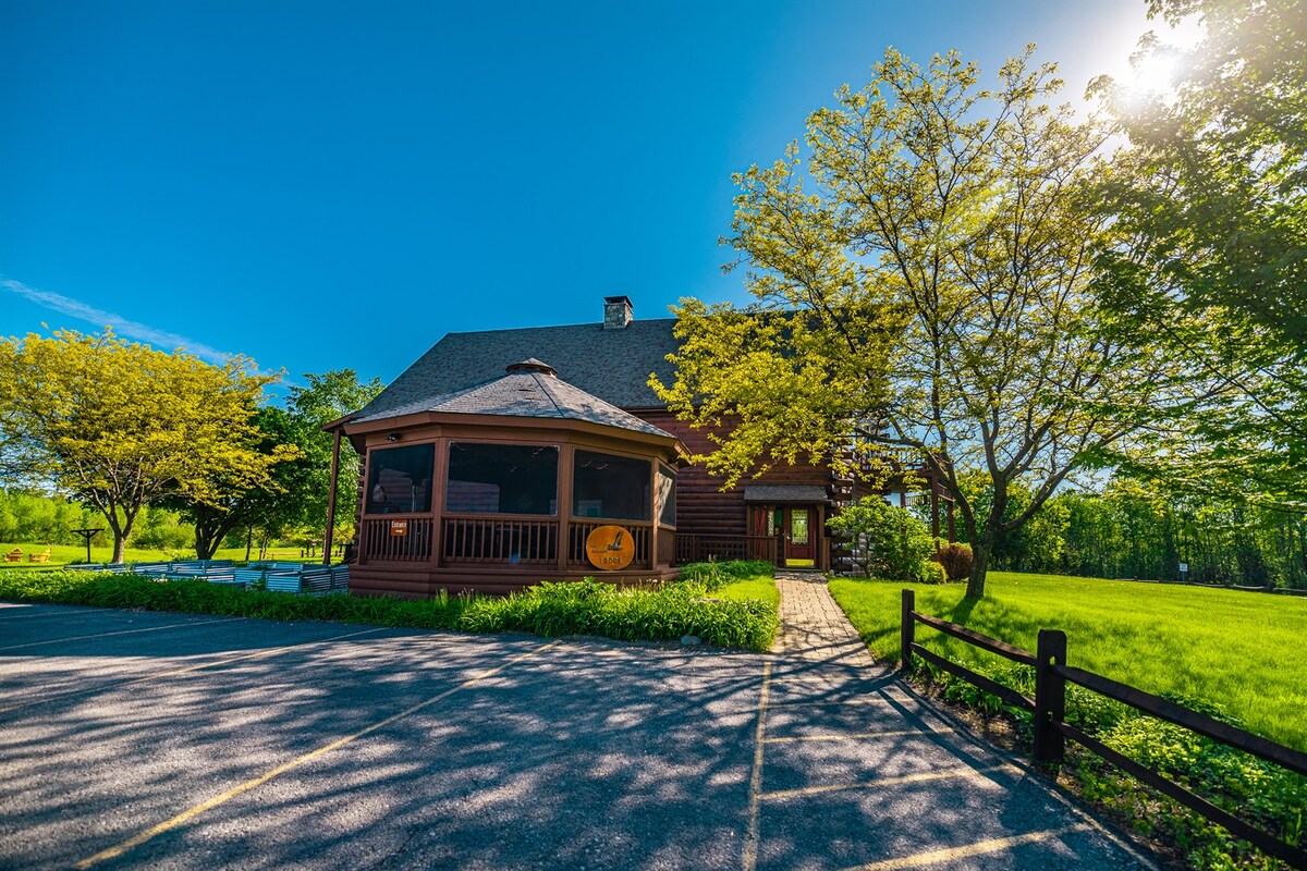 The Angler Room at the Point au Roche Lodge is a tribute to the fishermen. With log walls and birch-bark curtain rods you feel like you're tucked away in your own little log cabin. This room has many windows with views of the meadows and forest. Handicap accessible, the Angler is on the first floor and has the option of the bed being two twin beds. The private bath offers a walk in shower, pedestal sink and toilet.