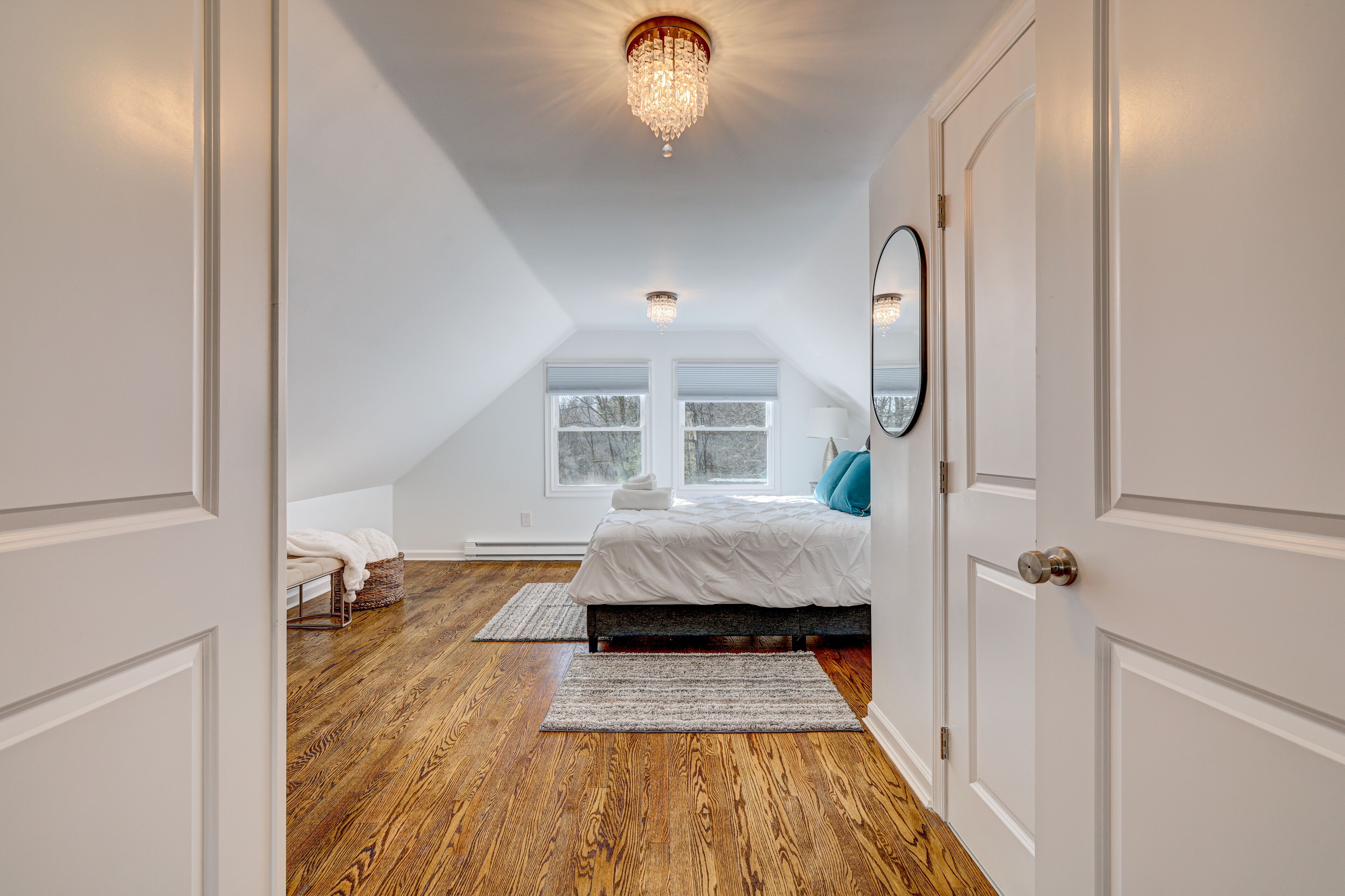 The chalet sleeps up to eight (8) people. On the main level, you’ll find a private suite with a sleep-number king bed and full bathroom that includes a whirlpool tub (great for a post-hike soak!), an open concept living/dining area - perfect for listening to music as you prepare your next charcuterie spread in the fully equipped kitchen, a spacious sunroom (stocked with books, board games and puzzles), another bedroom with a twin xl over queen bunk bed, a full bathroom, and a separate laundry room. Upstairs, there is an additional bedroom (two twins + a queen) and a full bathroom, plus a private balcony!