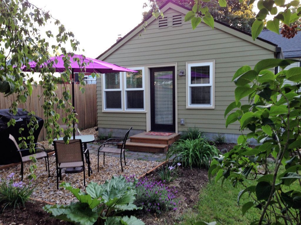 This lovely, airy and bright, 1 bedroom studio style cottage is complete with all the amenities you will need. It is nestled in the back yard with it's own private back patio and BBQ. With a fully stocked kitchen, heat/AC, Roku TV, fast WIFI and washer/dryer this is the perfect cozy cottage after a day out exploring. Sit and enjoy some quiet time with your coffee in the morning sun and the birds right out the back door. Our guests will enjoy full use of the private driveway equipped with an EV car charger. Walk to Mt Tabor, our local volcano, and enjoy the best view of the city. The unique shops and restaurants of the Jade district are a few blocks away and a grocery store is around the corner. The cottage is just minutes away from Interstate 205, 15 mins to the airport and downtown. The cottage features beautiful photos from a few of Becky's favorite local hiking trails. During the summer months guests may help themselves to the fresh produce in the garden.
