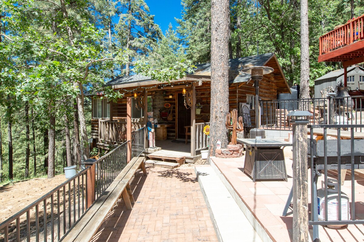 As you leave the square towards the cabin, you ascend an additional 700 ft. into the tall 80 ft. Ponderosa Pines and Oak trees to a quiet, peaceful hideaway. The cabin sits on 1 acre off a private street with only four other homes nearby. If you like a peaceful environment, this is the place for you -- if you listen, you can enjoy the sounds of many kinds of Southwestern birds, and you might even catch a glimpse of deer, javalina, squirrels, rabbits, or even wild turkeys!