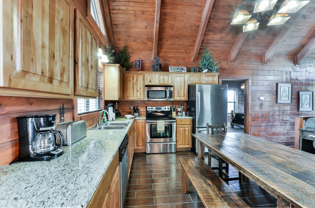 This authentic log home features two Master Suites, each with a king sized bed, jetted tub and separate shower. It also features a full kitchen for cooking, complete with microwave and coffeemaker. The cabin is beautifully decorated with rustic yet elegant furnishings and the large windows let in tons of warm sunshine during the day.