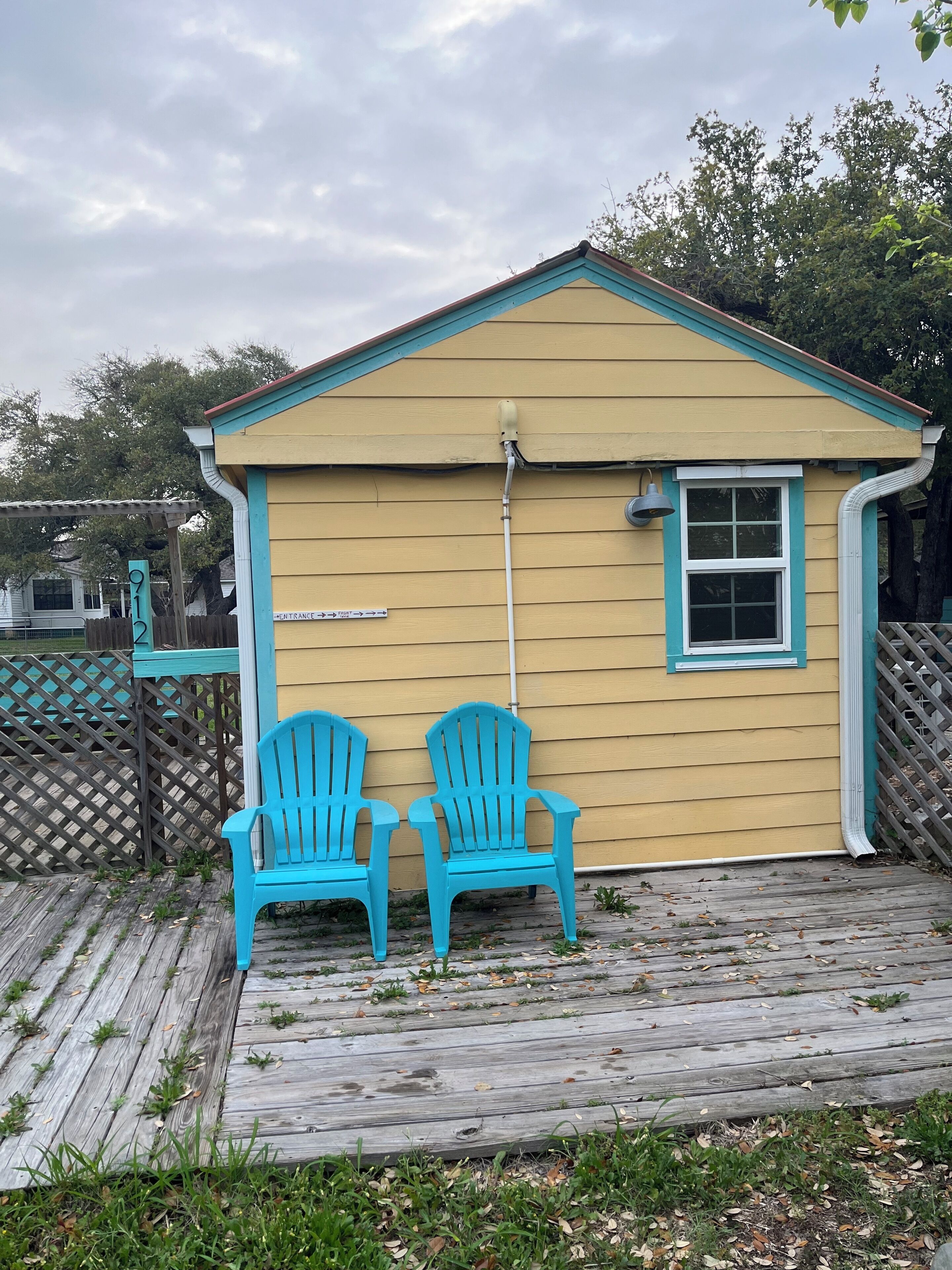 This cozy cutie is the perfect getaway for 2. Tucked away on a quiet, private half acre among beautiful live oak trees, yet only minutes from everything Rockport-Fulton has to offer. Great restaurants, shopping, and art galleries. The beach is 7 minutes away by car. Enjoy your morning coffee on the large L-shaped deck, complete with comfortable outdoor seating and a bistro dining set. Relax after a day of fishing or shopping around the firepit under the stars. Inside you'll find wood-look vinyl flooring throughout, tons of natural light, a queen bed with built in storage on either side, a roomy bathroom with a relaxing rainfall shower head in the tiled shower. The kitchenette has a mini fridge, a sink, coffee maker, blender, and toaster. There is WiFi and Roku television. Be sure to bring your boat, the boat ramp is 5 minutes away and there's plenty of parking at the cottage.