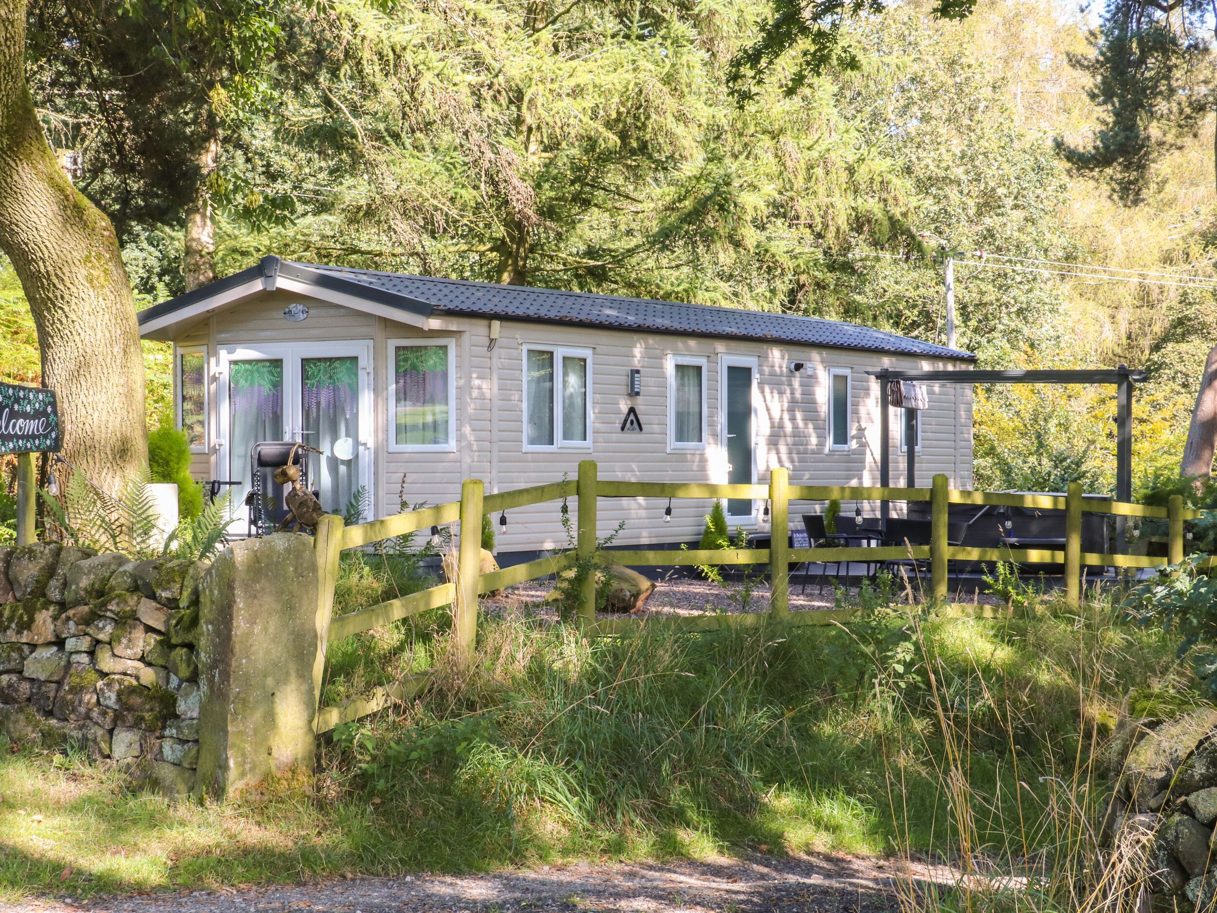 Amenities: Gas central heating and underfloor heating throughout. Electric oven and gas hob, microwave, washer/dryer, fridge/freezer, dishwasher, TV with Freesat, WiFi, selection of books, games and DVDs. Fuel and power inc. in rent. Bed linen and towels inc. in rent. Off-road parking for 4 cars. Decked area's to front, rear and side. Side decked area has patio seating for 6 and six person hot tub. Enclosed lawned garden leading through a gate to a larger shared grass area with additional access to Rudyard Lake. Two well-behaved pets welcome. Sorry, no smoking. Shop 2 minutes walk (onsite). Pub 3 minute walk (Rudyard Hotel). Shop is on caravan park and sells most essentials.