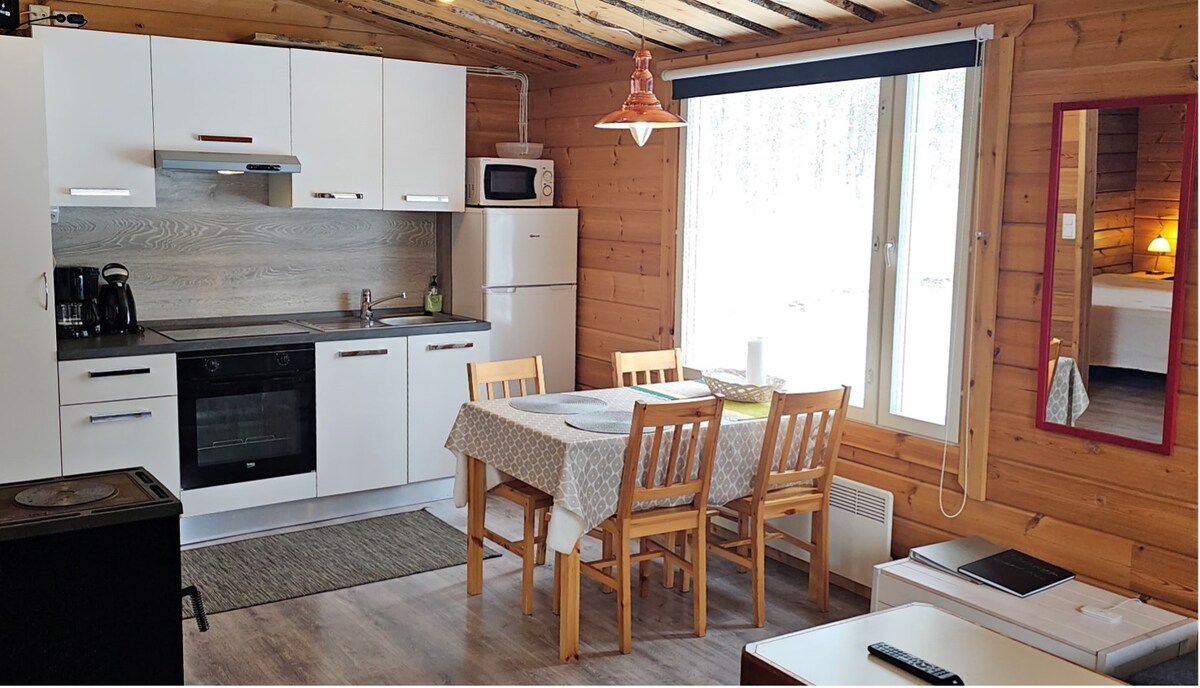 My cabins, E39, E40 and F44, all almost identical, locating in the same housing company, are fitted with all modern essentials, open plan kitchen-lounge area, with log burning fire place, private sauna adjoined to shower room, guest toilet, free WiFi.