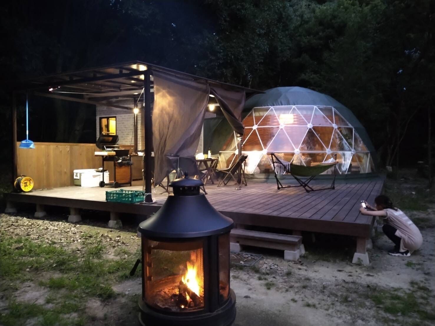 It is a dome tent full of privacy with only 2 buildings on the vast site / On the spacious deck a building bathroom washroom flush toilet jointed with a dome tent with a diameter of 6m