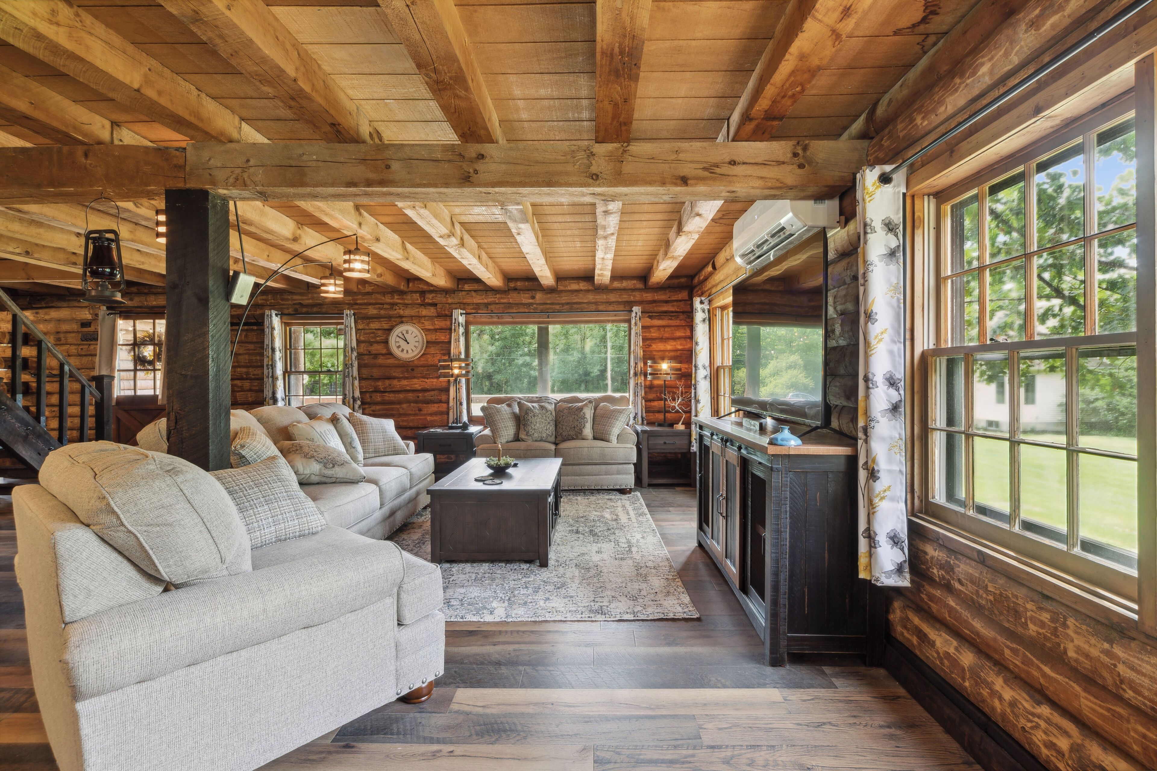 Impressive two-story log home, hand-built from poplar trees grown minutes from the property! The interior one-of-a-kind staircase made of 1/2 logs leads you upstairs to the 5 spacious and beautifully decorated bedrooms, each laid out with you in mind, plus full bath w/ tub, and private home office.