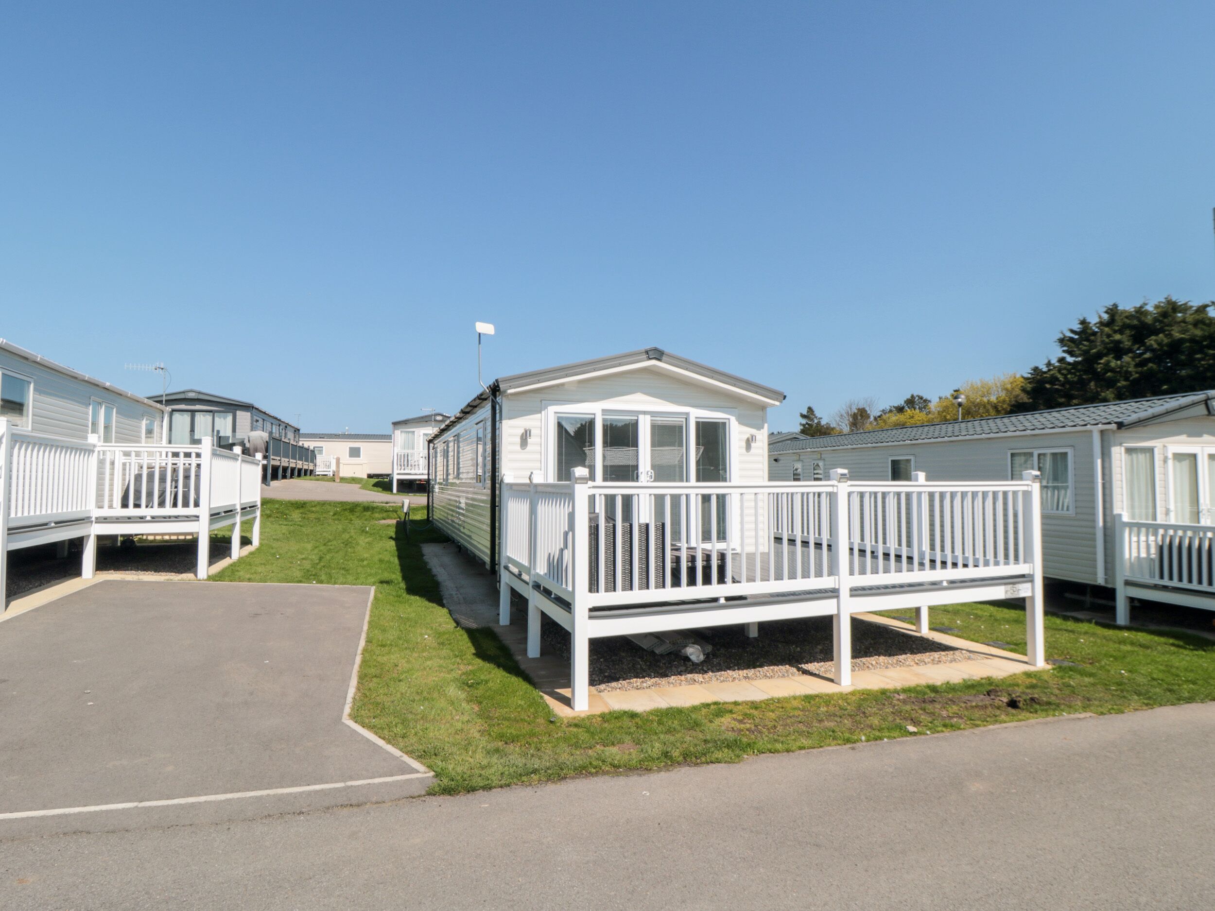 Our cozy 3-bedroom family-friendly lodge features an en-suite shower and a modern kitchen with a washing machine and dishwasher. Each bedroom has wardrobes and bedside charging sockets. Relax in the spacious living area with a Smart TV and free WiFi. Step through the French doors to a large balcony with outdoor seating and a swinging chair. The wrap-around decking, with a safety gate, ensures children and pets can play safely. A second door provides easy access. Ideal for a relaxing getaway