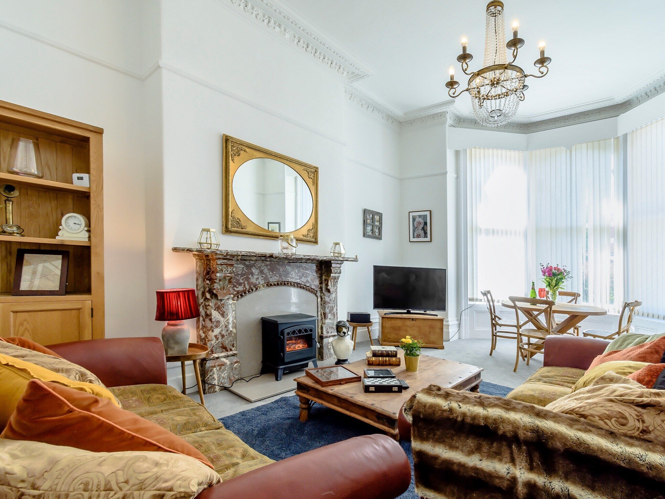 Step inside the open-plan living space featuring a quaint yet fully-equipped kitchen and a lounge-come-dining area, beautifully-decorated in a country lodge style, with a large wood burning stove for cosy evenings in.