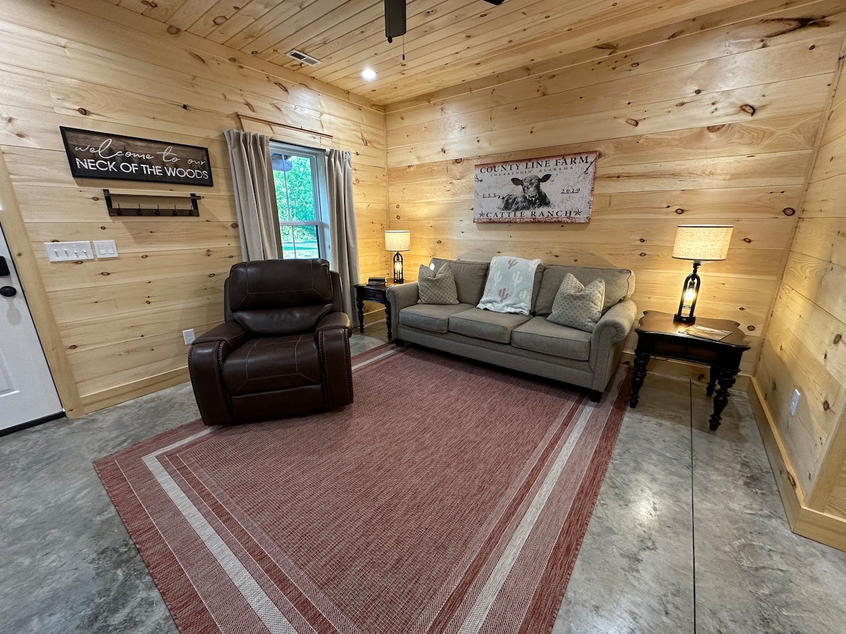 Relax with the whole family at Angler's Retreat Cabins, which sits in 32 acres shared with 7 other cabins. River Retreat offers covered boat parking with lights and electric for charging. We are 30 minutes from Huntsville. The cabin offers outdoor sitting areas and a fire pit to enjoy a peaceful evening.