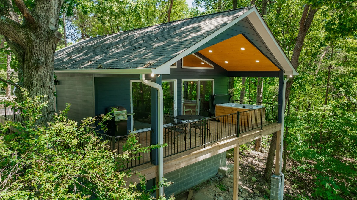 Our unique home sits atop the mountain and is built literally on the edge of the undeveloped side of the brow, it is open style with windows throughout both sides and both floors of the entire home, and tub. There is a great-room downstairs as well with large flat screen TV over the spacious gas fireplace and a queen sofa sleeper .PLEASE NO PETS ALLOWED