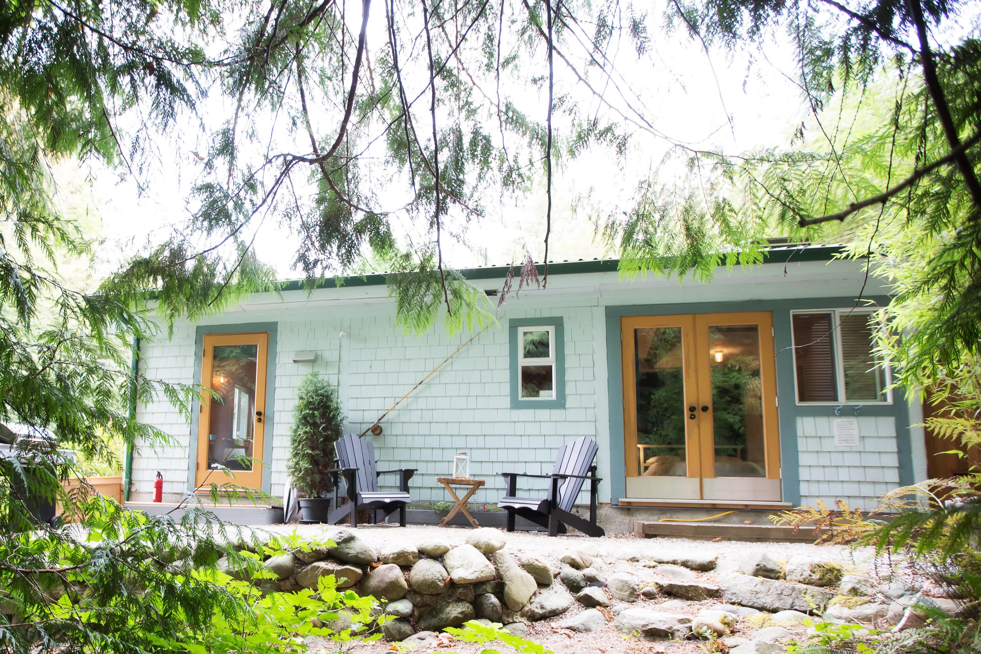 The bedroom has french doors that open out into the river garden and overlook the forest, the bed is comfy and our down duvet will keep you warm at night. The bathroom has a shower stall, with a view over the river. The kitchenette includes a small fridge, 2 burner induction stovetop, toaster, microwave, coffee and tea making facilities and all utensils needed for cooking outside on the stainless steel BBQ in your own private secret garden. The garden is complete with a babbling brook, waterfall and you can take a dip in our 4 person hot tub under the stars at night or peak out at the ocean during the day. The open plan living area has a view of the inlet and the local mountains and is the perfect place to feast on seafood or sip on a glass of wine as the afternoon sunlight filters through.