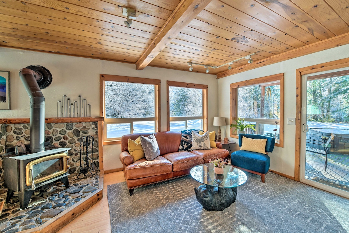 Enjoy breathtaking nature while staying close to top winter and summer activities. Whether you’re skiing, snowboarding, rafting, swimming, hiking, or just relaxing by the fire, this short-term rental near Stevens Pass is the perfect getaway.