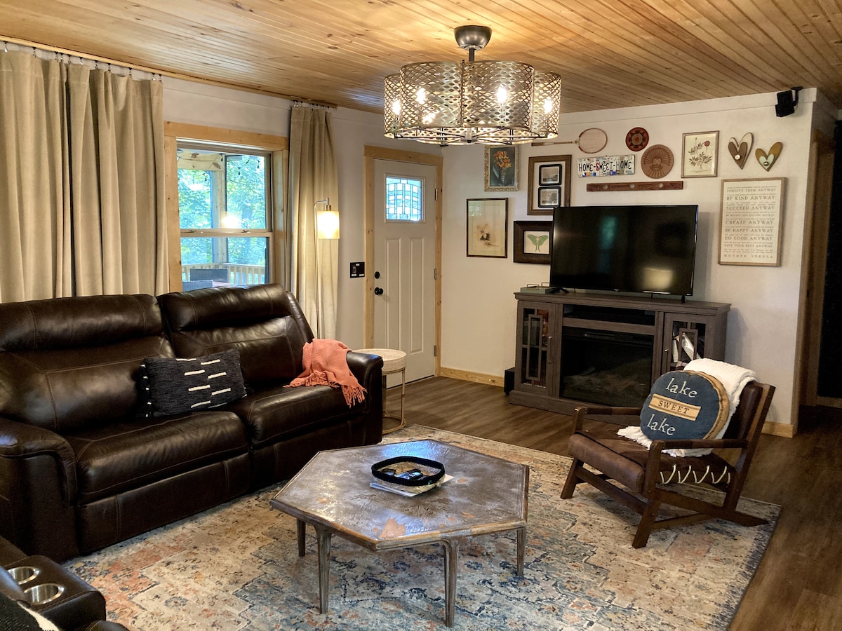 Welcome to your newly renovated cedar cowhide cabin home away from home! Prepared to relax as soon as you step inside the spacious 4 bedroom 3 full bathroom home. After an adventure pack day around Center hill lake, you would love cooking in the well-equipped kitchen complete with stainless steel appliances (double ovens) and granite countertops. Enjoy a meal together at the custom cedar log table and chairs along with seating on the cowhide barstools, before turning on the remote controlled gas fireplace. Then sink into the comfy leather cowhide couch while watching your favorite movie on a smart TV. Or step out onto your cedar deck with views of Centerhill lake below.