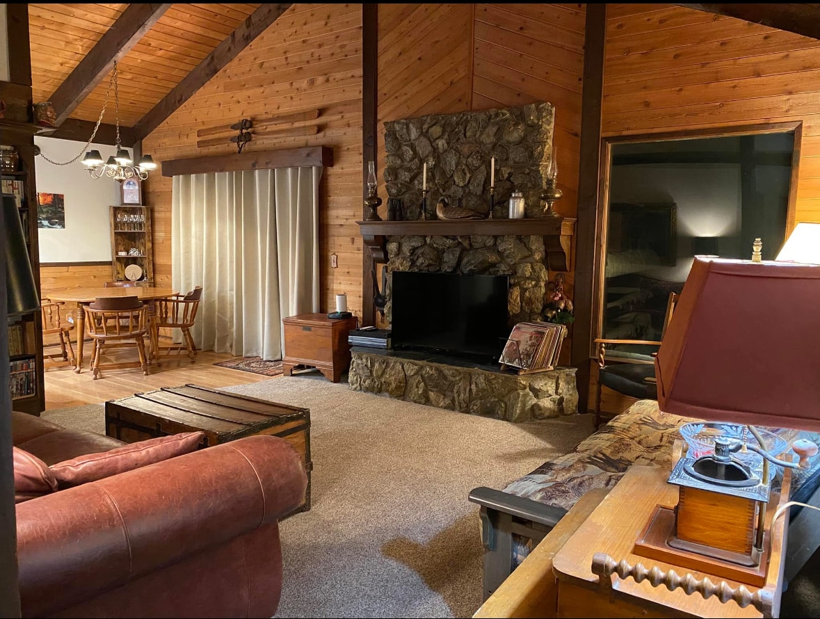 This lovely cabin has a nice size backyard perfect for kids and dogs! Inside, gather around the gas fireplace to plan your next adventures. Spend entertaining evenings playing board games with your loved ones. Some of the games provided include Scrabble, Catch Phrase, Rummikub, dominoes, playing cards, and backgammon. The well-equipped kitchen has all the essentials to prepare delicious homemade meals for everyone, however, there is no dishwasher available. The first floor of the cabin has two comfortable bedrooms, while the lofted area upstairs hosts an additional sleeping area with a smart TV with streaming and cable options.