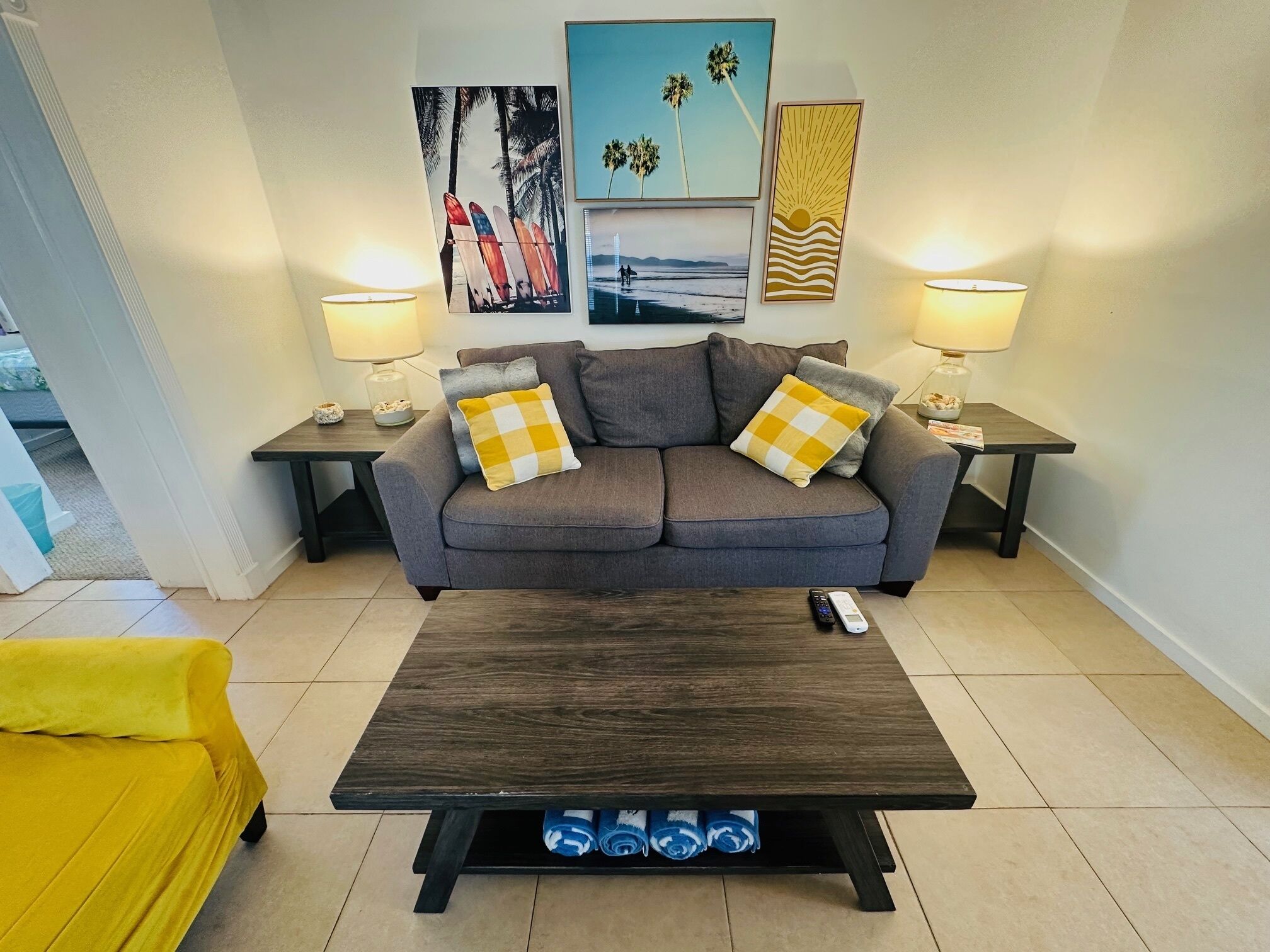 Nestled just five houses away from the mesmerizing beach and two houses from the enchanting intercoastal, this charming 1-bedroom, 1-bathroom beach bungalow is a dreamy retreat that accommodates up to 2 guests. As you step into this coastal haven, you're greeted by the cozy living room gathering spot, equipped with a cutting-edge smart TV for your entertainment needs.