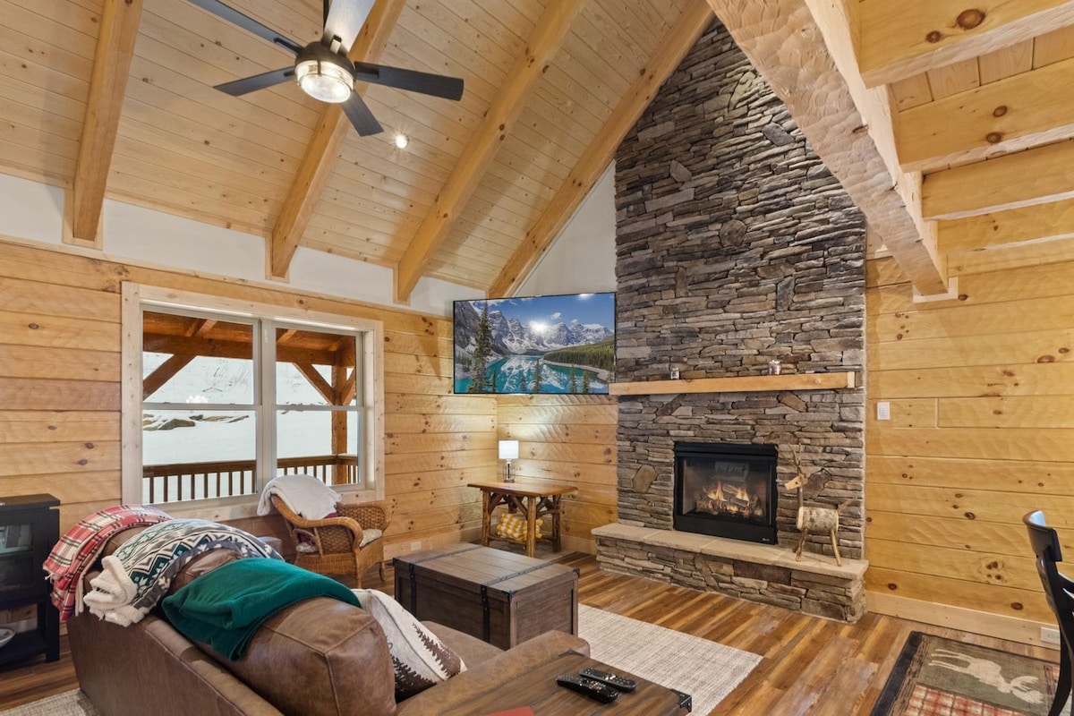 The main level of Sugar Bear boasts wood floors, antler chandeliers, and vaulted, tongue-and-groove ceilings, and exposed beams. The great room features a large HD Smart TV, leather furniture, and a floor-to-ceiling river rock fireplace with gas logs. The adjacent dining table seats six, plus two more on bar stool seats at the kitchen bar top, for a total of eight guests. The kitchen is well equipped to prepare and serve meals to a packed house. Guests can even enjoy the long-range views from the kitchen sink!
