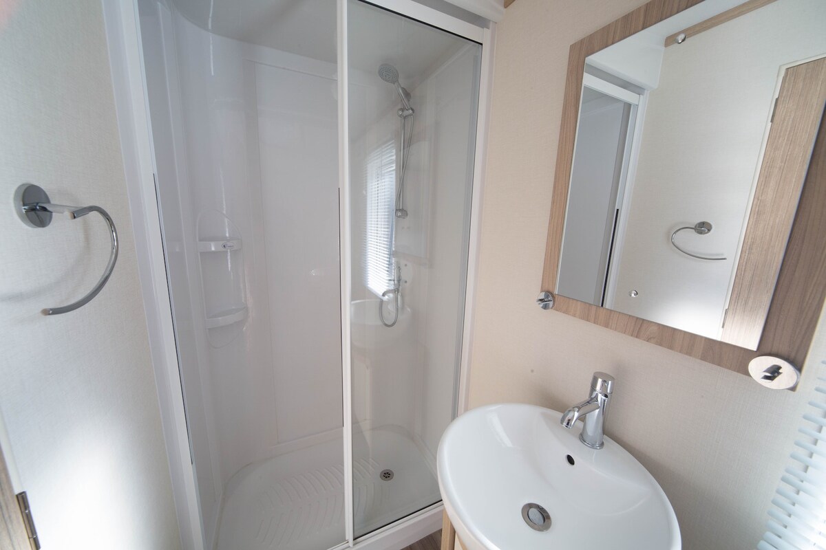 The whole property benefits from park-controlled free Wi-Fi, a gas central heating system with radiators, double-glazed windows, and secure railed and gated decking area. Outside there’s private parking available for two cars towards the rear side of the lodge.