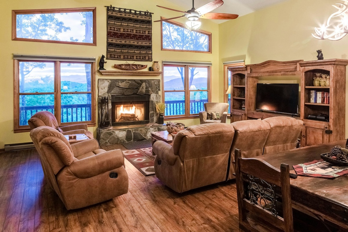 Relax and rejuvenate at Bella Vista! Perched on a mountain top, this log cabin provides breathtaking 30-mile views. Watch the sunset over the mountains or enjoy an unobstructed view of the stars at night from the deck. The home incorporates custom cedar construction into an open living area, a fully equipped kitchen, and a wood-burning fireplace. The lower level den has a pool table, foosball table, and an additional TV.